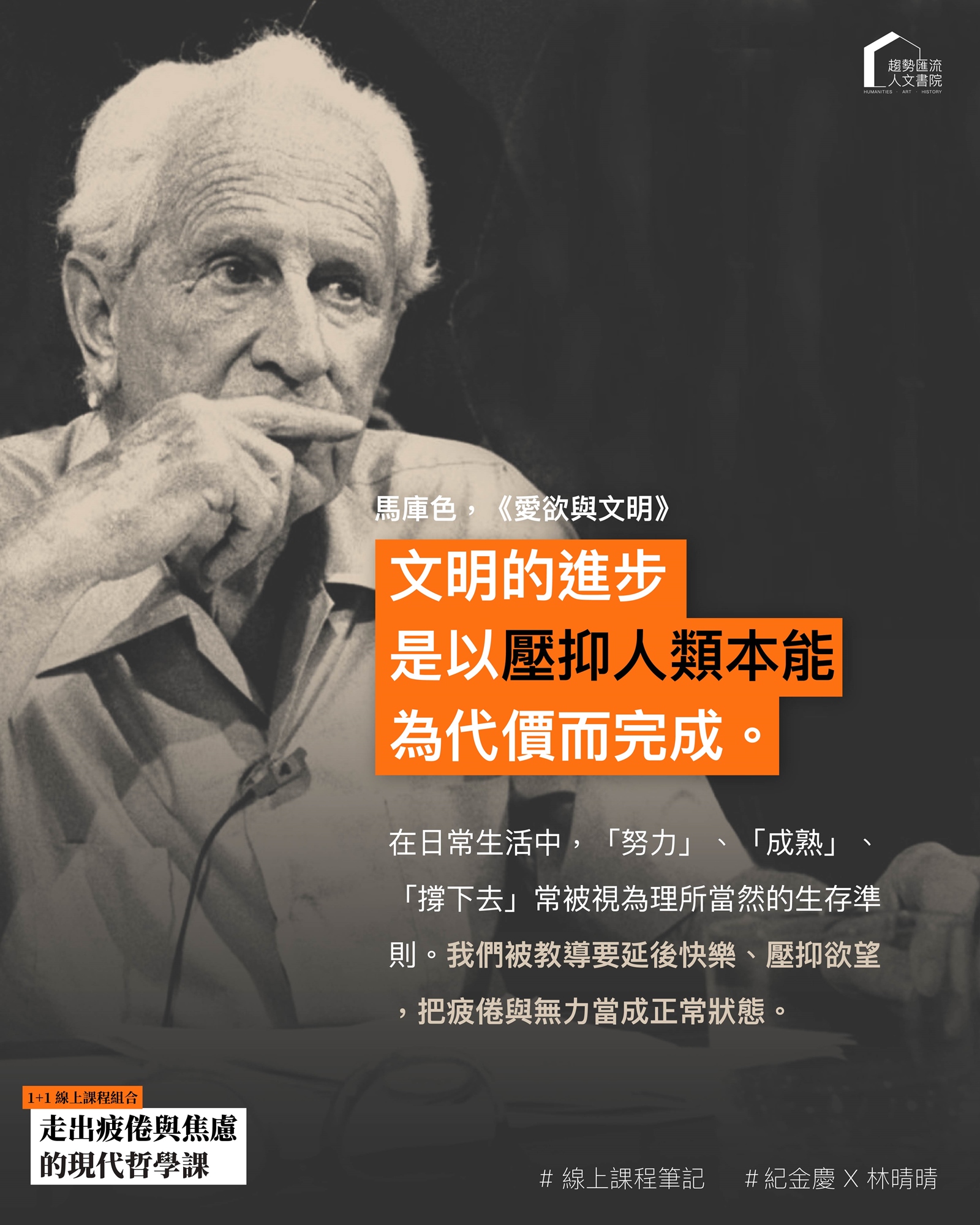 海德格透過「此在」與「本真死亡」之概念,引導我們重新面對生活的情境、時間與承擔;馬庫色則以《愛欲與文明》質疑現代文明對身體與慾望的收編,並提出「非壓抑性昇華」與「愛慾的美學化」的可能。從奧菲斯的回頭到納西瑟斯的凝視,從死亡的靜謐到感官的共振,我們將思索:是否存在一種不壓抑、不工具化的生命形式?當愛慾不再被犧牲,我們會成為什麼樣的人?