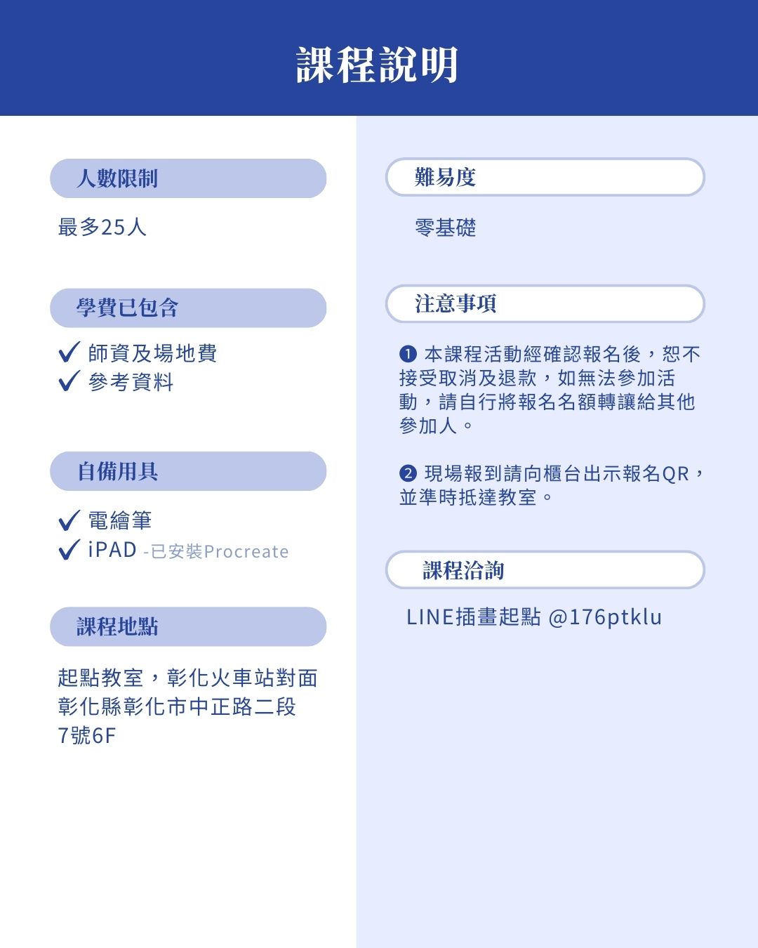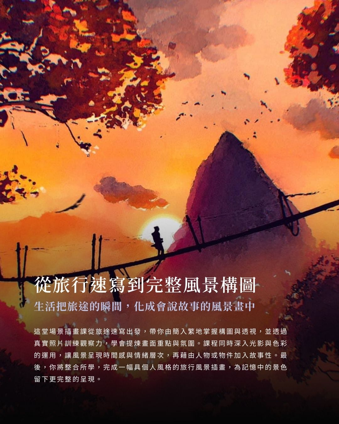 本課程為< 場景插畫課 >單堂的體驗課3hr請自備用具平板與電繪筆,ipad預先裝設付費繪圖軟體Procreate。