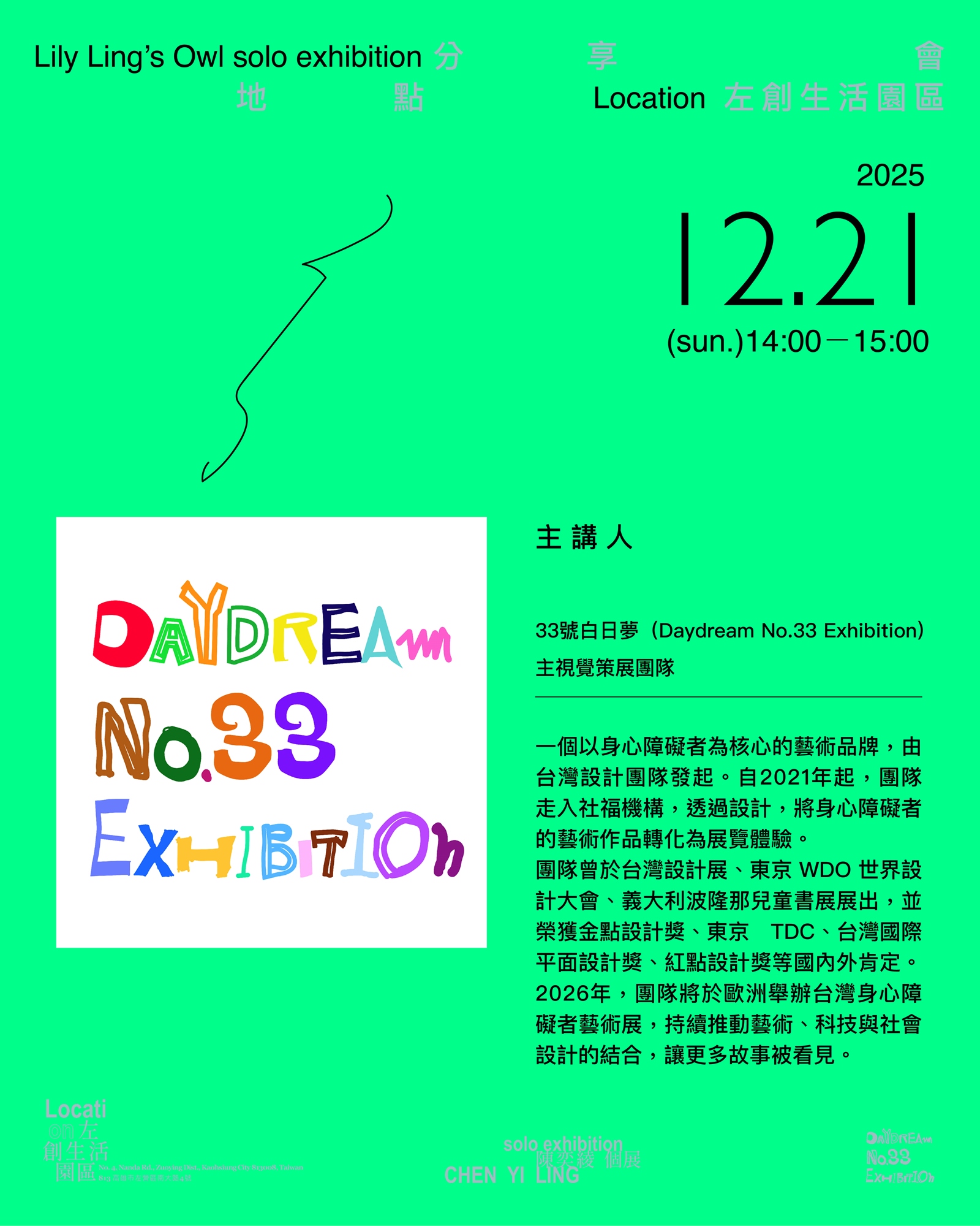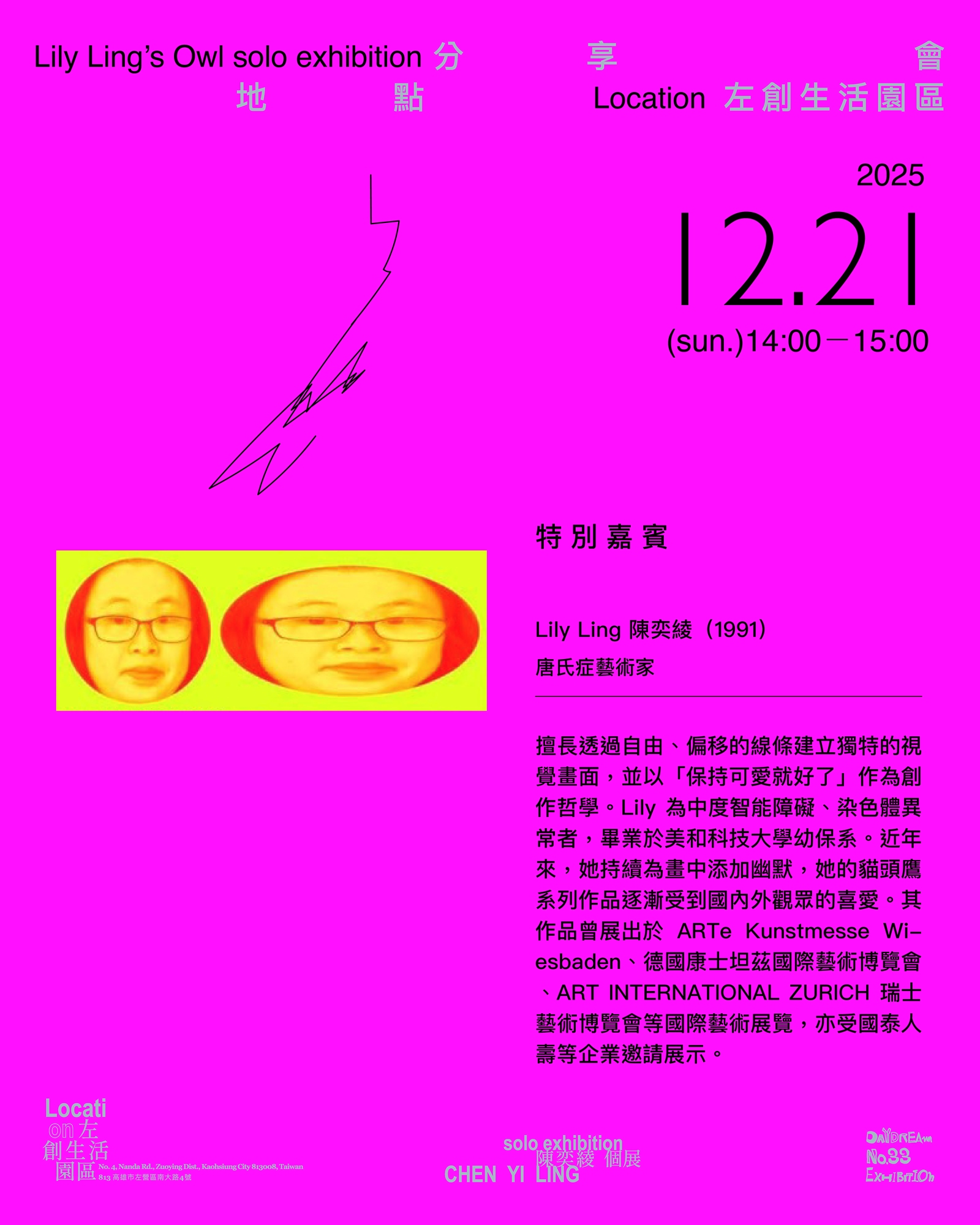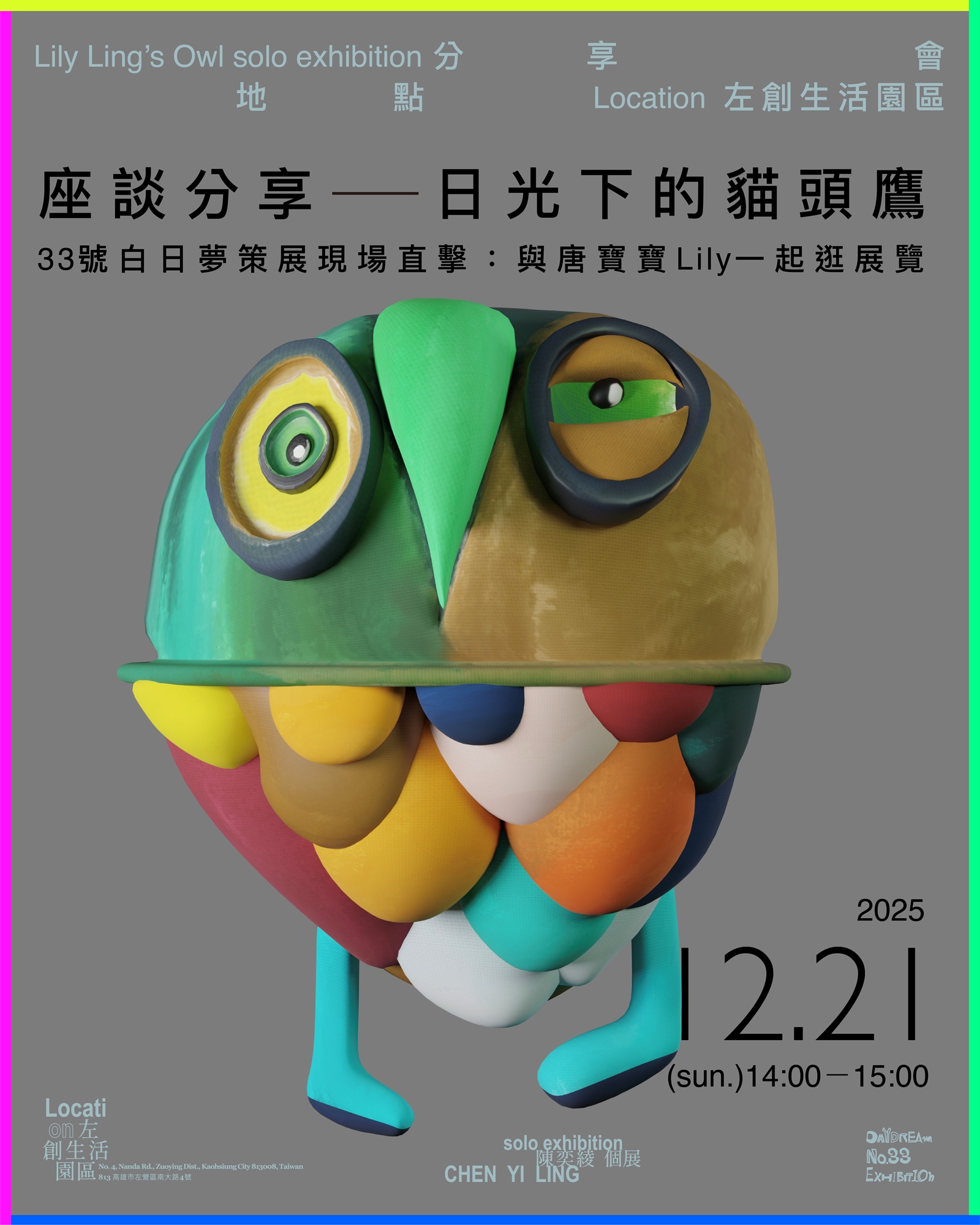 從理解Lily與貓頭鷹之間的情感連結開始,策展團隊將完整分享展覽從概念發展、視覺與空間設計,到實際執行過程中的思考與取捨,揭開那些未曾被公開過的決定。分享會後段,藝術家Lily Ling也將親自出席,與現場觀眾進行QA問答交流,回應關於創作、貓頭鷹,以及她眼中那個微微傾斜卻鮮明的世界。