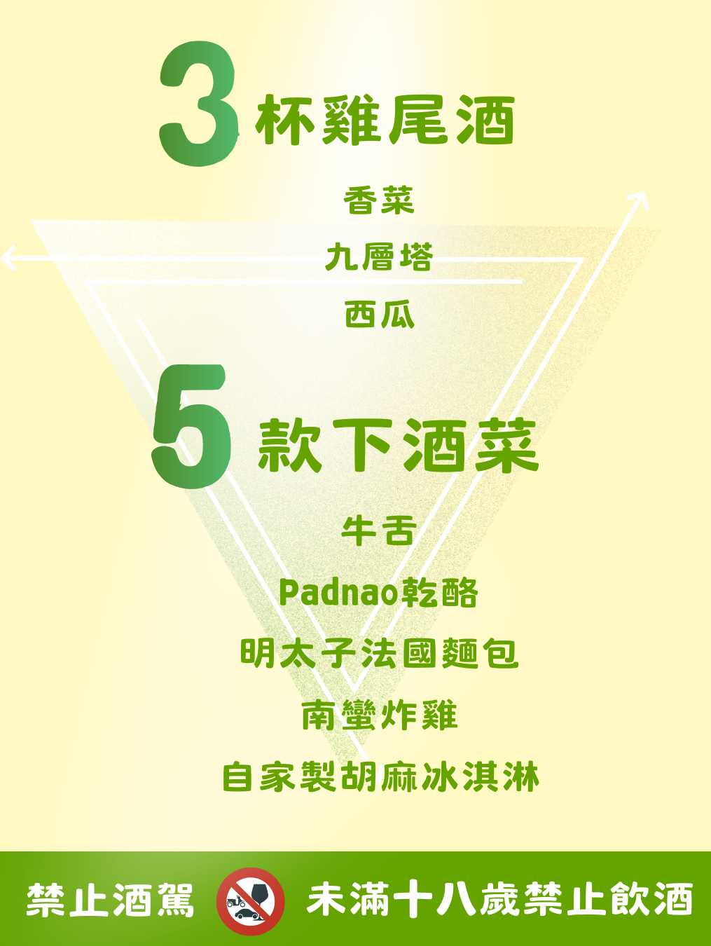 3杯調酒 搭配 5款料理,並由調酒師Ben介紹酒款與解說風味搭配概念。