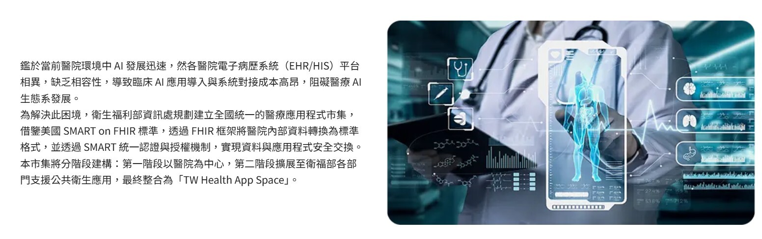 本次計畫將以全國競賽的方式,徵集國內已實際在臨床使用、或已取得台灣TFDA認證的優質智慧醫療或數位健康應用程式。首波預計選出 50款符合SMART on FHIR標準、完成上架驗測的應用程式,進行獎勵與曝光,產品將正式上架到衛福部資訊處「臺灣醫療資訊標準大平臺」TW APP Gallery專區。