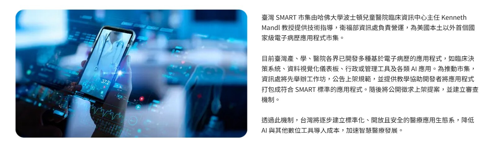 為推動我國智慧醫療生態系建構,衛生福利部資訊處與美國哈佛大學臨床資訊中心主任、同時也是國際SMART on FHIR標準發明人——肯南‧曼杜(Kenneth Mandl)教授合作,將共同打造台灣SMART Healthcare市集(SMART on FHIR Marketplace),促進我國智慧醫療應用國際接軌。