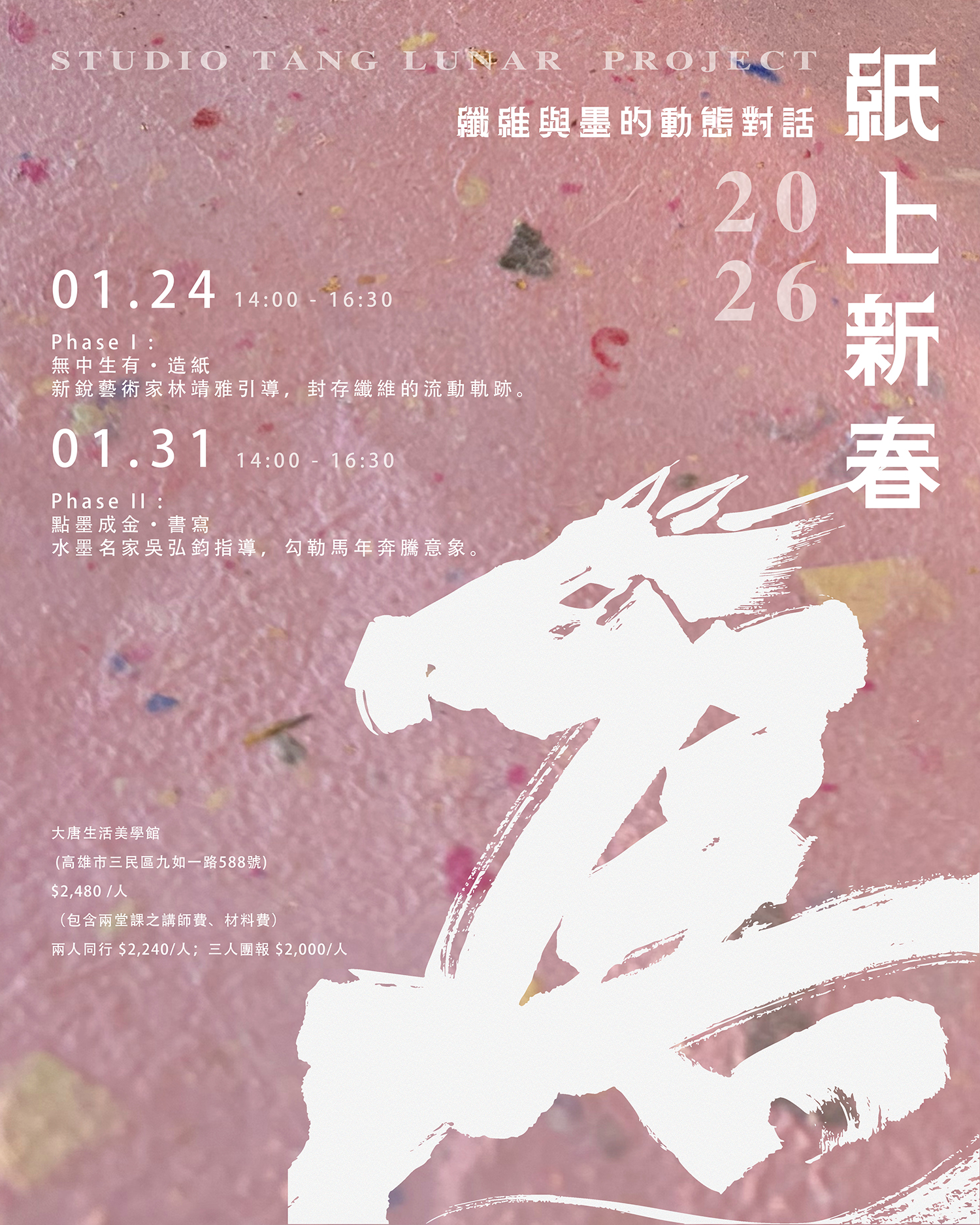 丙午馬年來臨前夕,大唐生活美學館啟動了一場關於「物質還原」的藝術實驗。我們邀請你暫離喧囂,回到時間與創作的原點——從紙漿的流動開始,捕捉纖維交織的瞬間;再以墨色入紙,讓當代書寫在自製的肌理上奔騰。