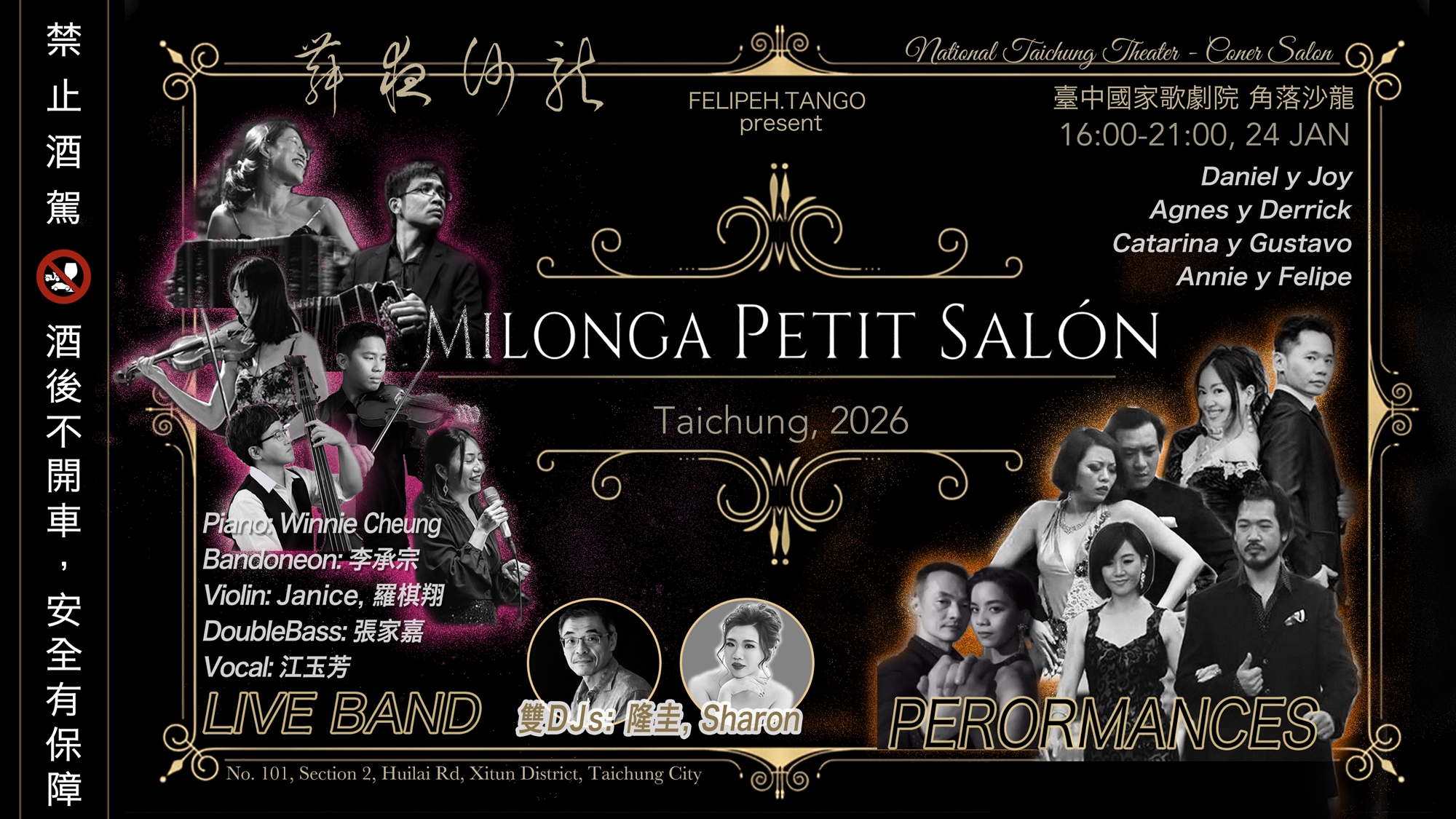 由足跡遍佈全球、國際知名的探戈演奏家 Winnie Cheung,以及台灣傑出班多鈕音樂家李承宗領銜,與台中在地樂團 Alma Tango 共組現場樂團的經典探戈舞會。中場時也將特別邀請台北幾位資深探戈舞者老師們表演,期許帶給大家一個難忘的週末午後夜晚。