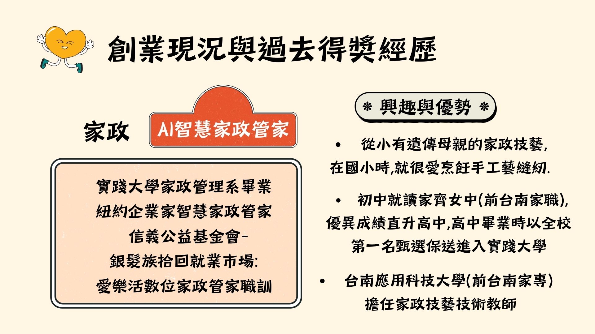 我於 1980 年創辦家政手工藝學院,曾獲青年創業貸款支持,並被選為創業楷模。其後進入大專院校任職家政老師,逐步將教學專業轉化為實務經營,陸續投入 家政、美勞、文創相關企業的經營與轉型。