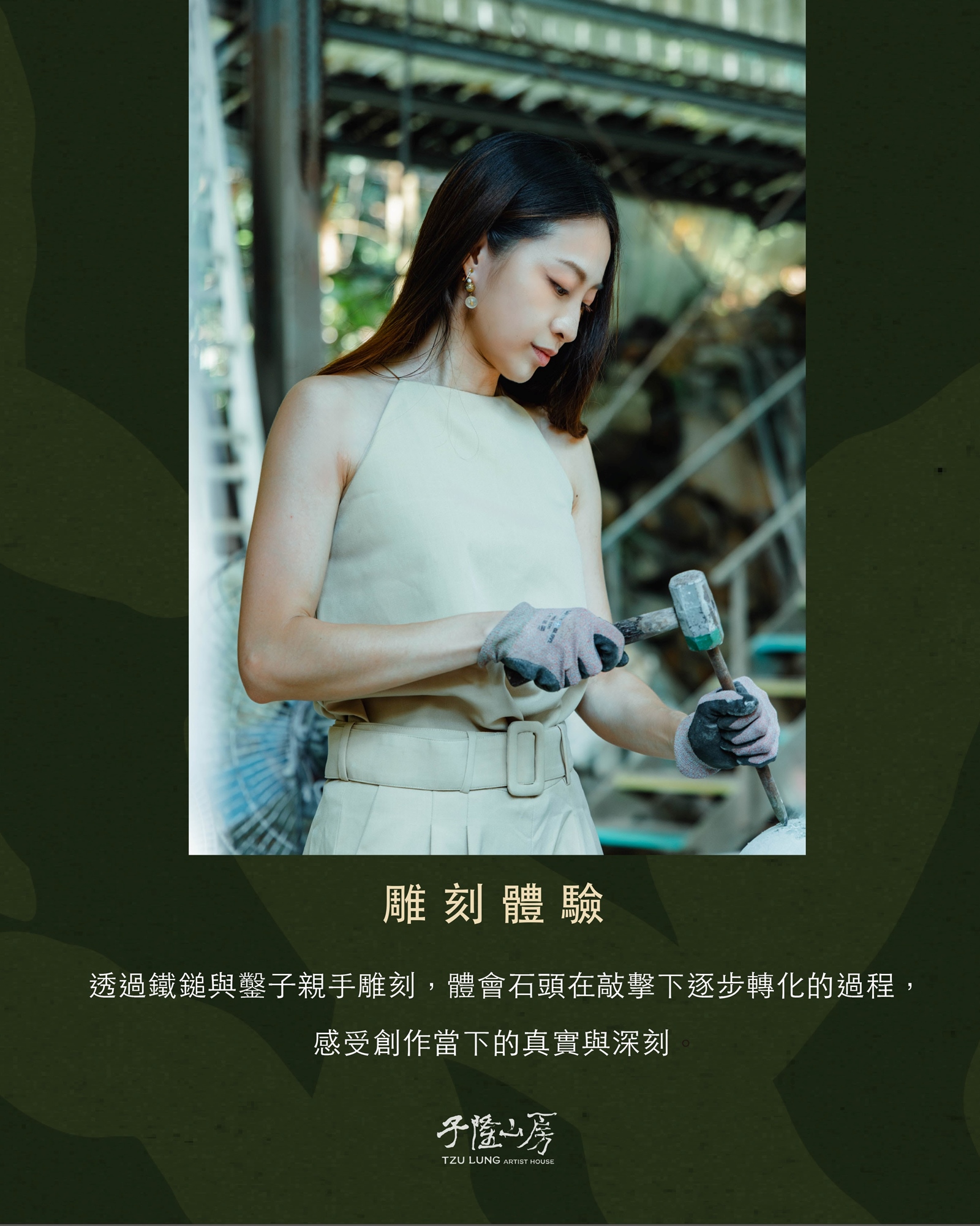 隱身山林間的子隆山房,是一座專為創作與內在對話而存在的靜謐空間。這裡遠離都市喧囂,綠意與山風環繞,為石雕創作提供最純粹且安定的環境。課程中,你將在自然光與蟲鳴鳥語中,學習如何從一塊原石開始,透過雙手慢慢琢磨出屬於自己的形體與語言。
