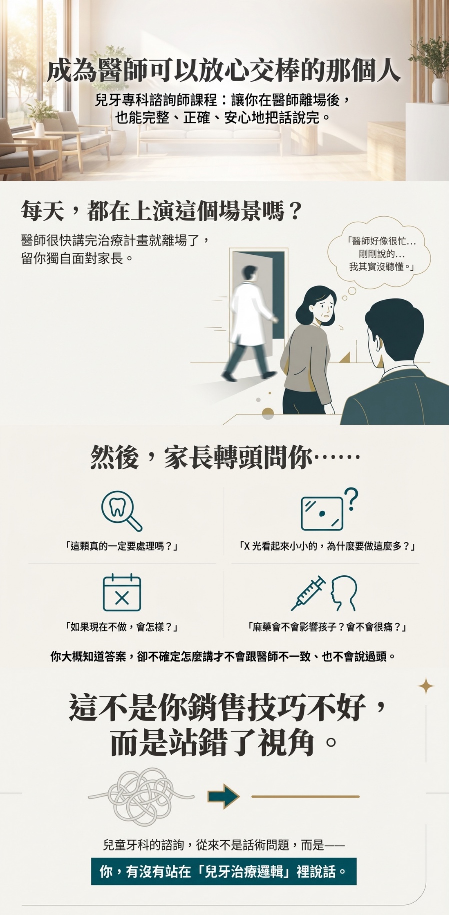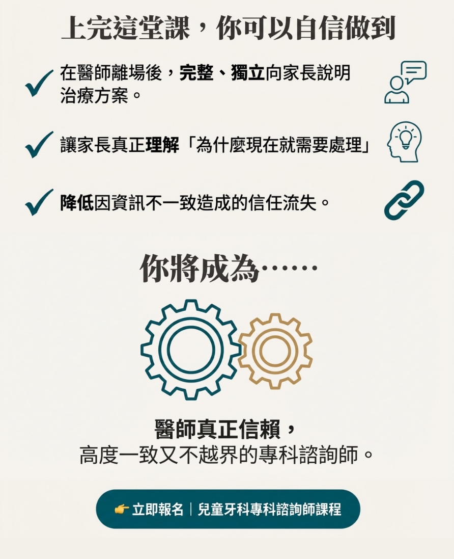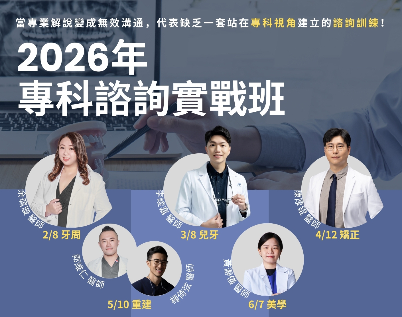 專科進階班《牙科諮詢師專科課程: 2/8 牙周、3/8 兒牙、4/12 矯正、 5/10 重建、6/7 美學 》
