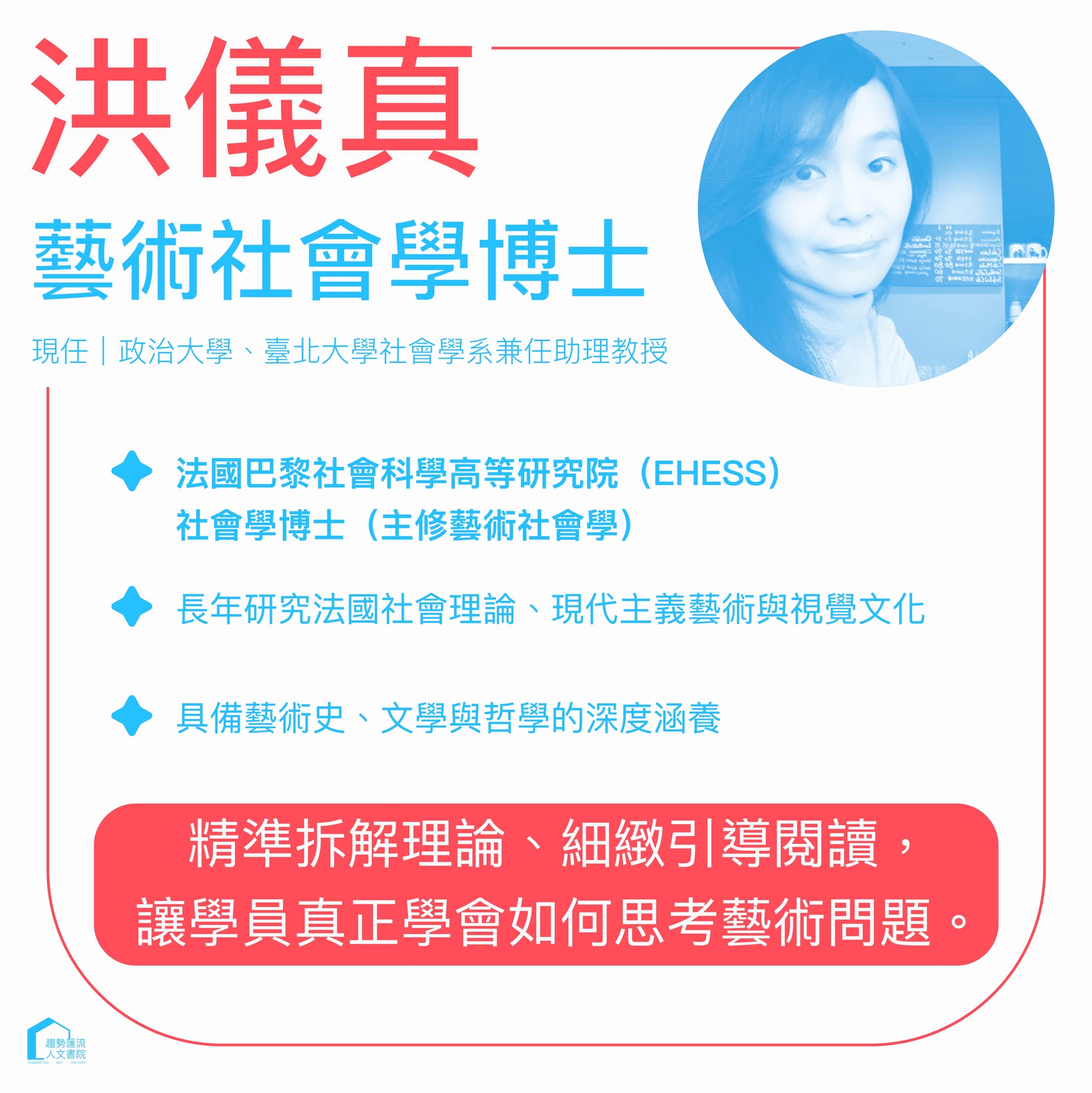 授課教師 洪儀真為法國巴黎社會科學高等研究院(EHESS)社會學博士,主修藝術社會學,長年研究法國社會理論、現代主義藝術與視覺文化,同時具備藝術史、文學與哲學的深度涵養。她的教學特色,不在於「給答案」,而在於精準拆解理論、細緻引導閱讀,讓學員真正學會如何思考藝術問題。