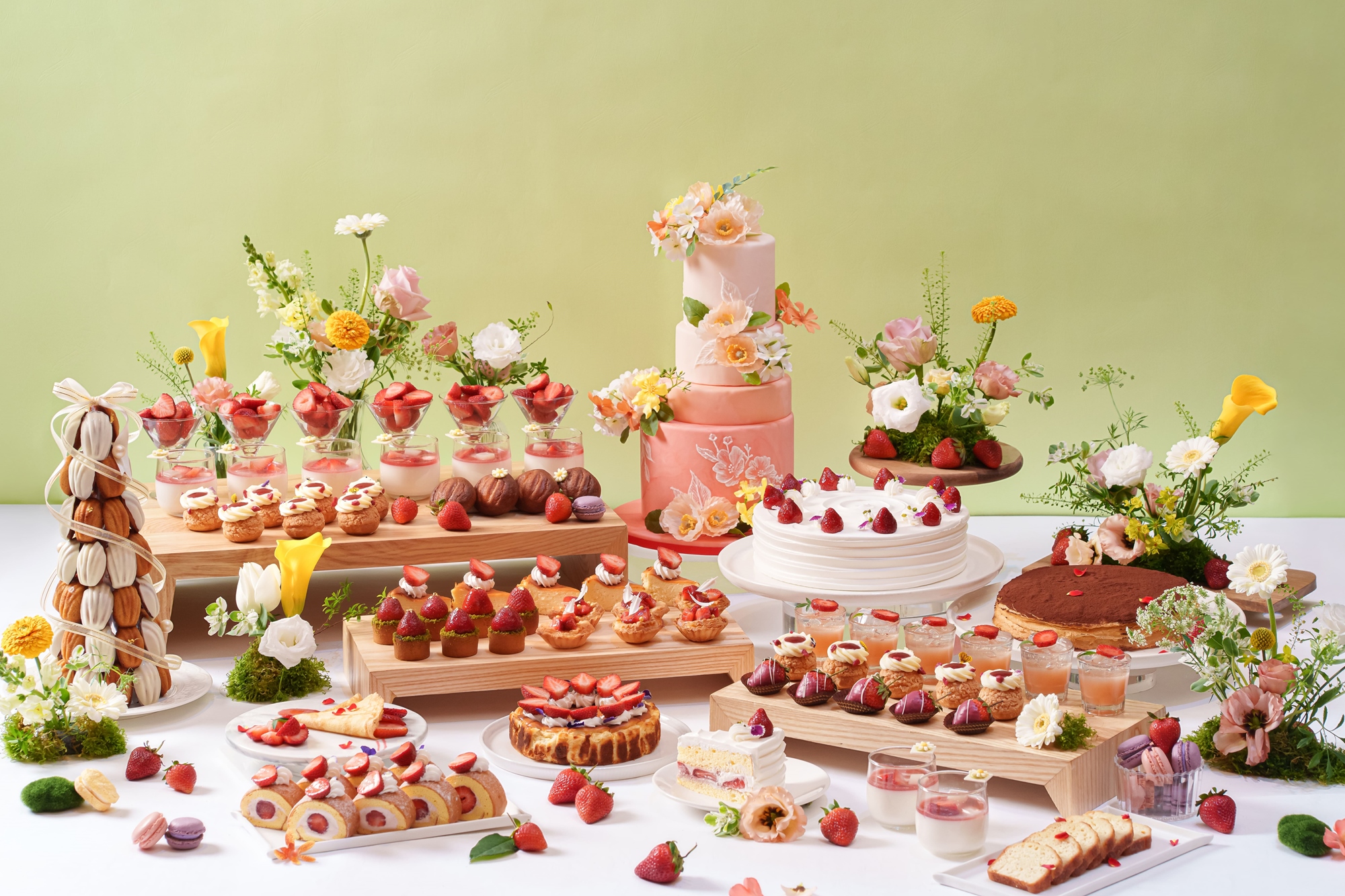 多款草莓系列甜點:草莓生乳捲、草莓鮮奶油蛋糕、草莓法式薄餅、草莓覆盆子奶酪及高人氣甜點–脆皮烤年糕等超過25道甜鹹食吃到飽,並與新竹在地質感花藝工作室「想想拾花」攜手佈置,打造春日意象的用餐氛圍。