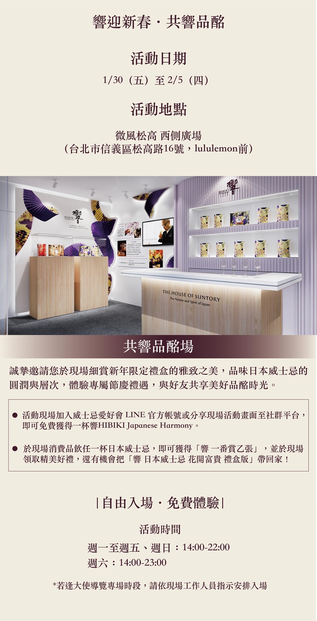 - 參與者填寫本活動參與所須個人資料後,以任何方式遞送至賓三得利台灣股份有限公司收執時,均視為已同意提供予賓三得利台灣股份有限公司辦理本活動之特定目的必要範圍內處理及利用;此外,參與者可決定是否填寫相關之個人資料欄位,若參加者不填寫相關欄位時,賓三得利台灣股份有限公司則於決定是否符合參與本活動之資格時,擁有自行判斷之權利。