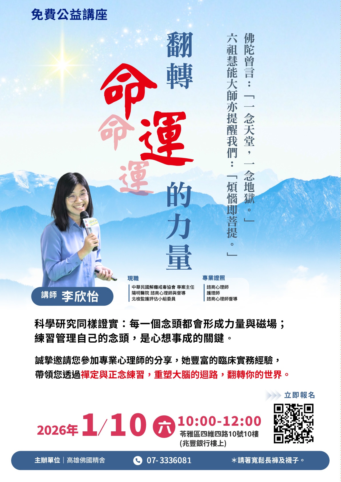 🔹誠摯邀請您參加專業心理師的分享。她將分享豐富的臨床實務經驗,帶領您透過禪定與正念練習,重塑大腦的迴路,翻轉你的世界。