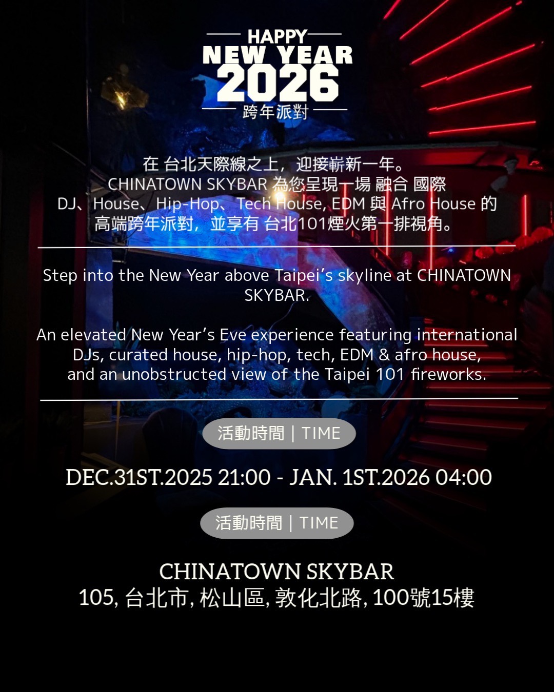 在 ChinaTown Skybar 為您呈現一場高端跨年派對