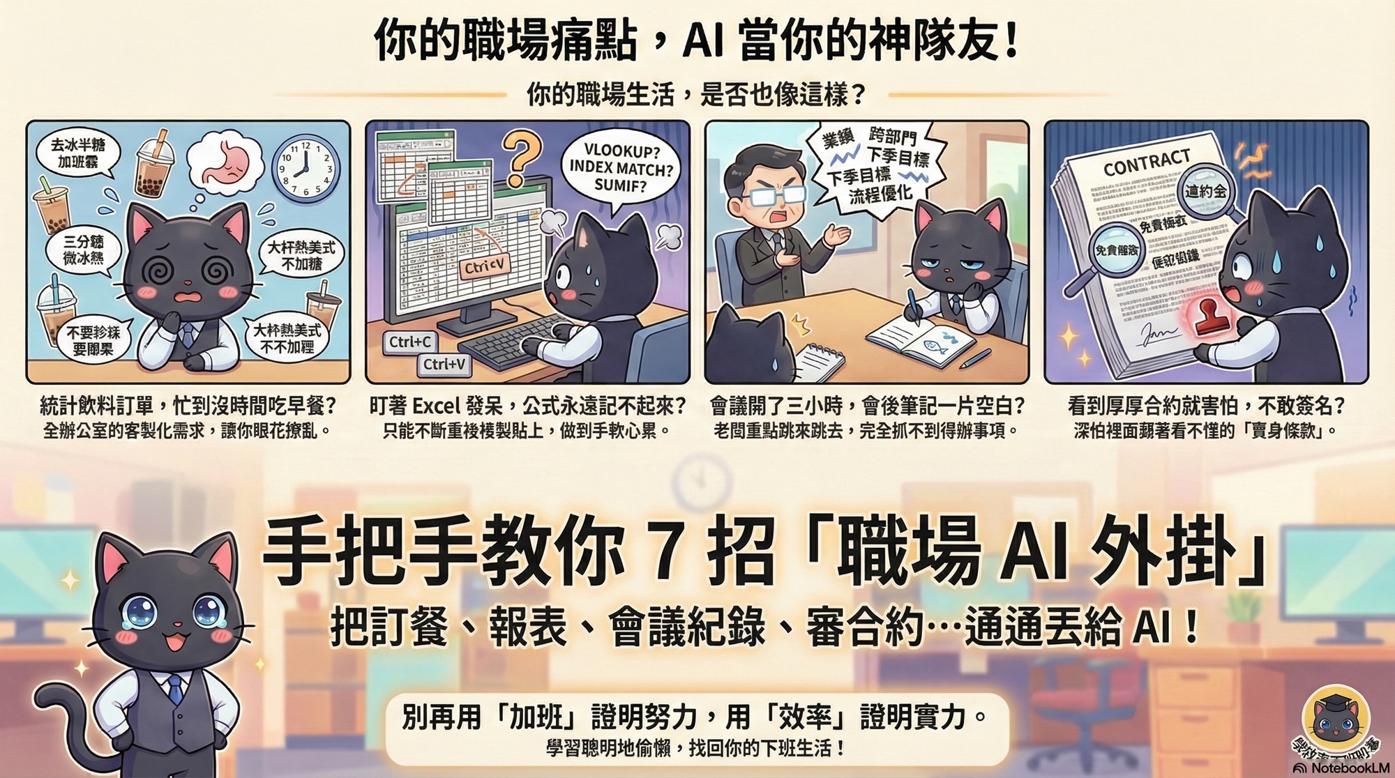 這堂課不教你寫複雜程式,也不講艱深的大道理。 手把手教你 7 招「職場外掛」,從早到晚,把不想做的事丟給 AI!