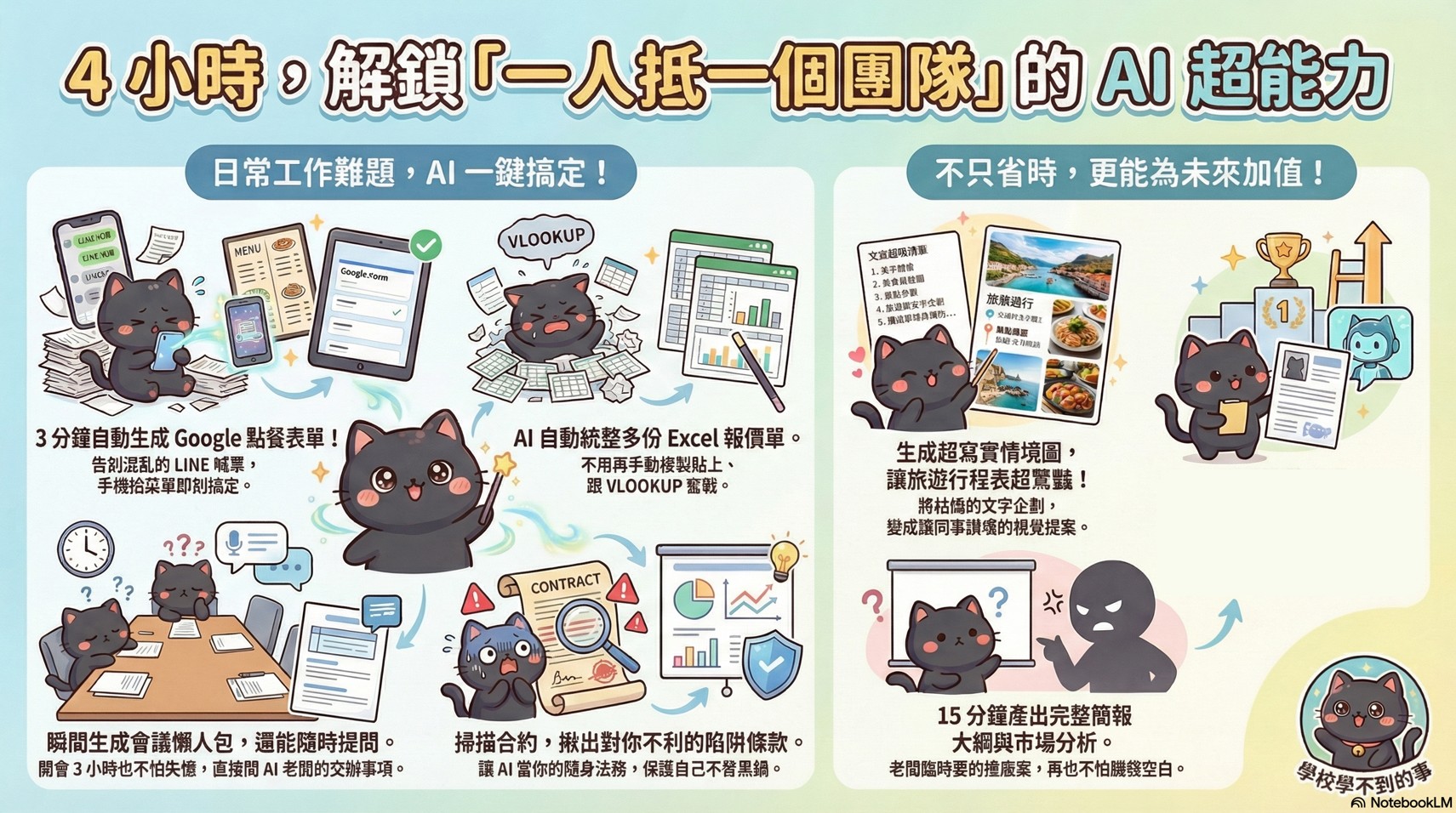 - 亮點: 員工旅遊行程表太乾?用 AI 生成「超寫實情境圖」,讓全公司對你的規劃能力感到驚艷!