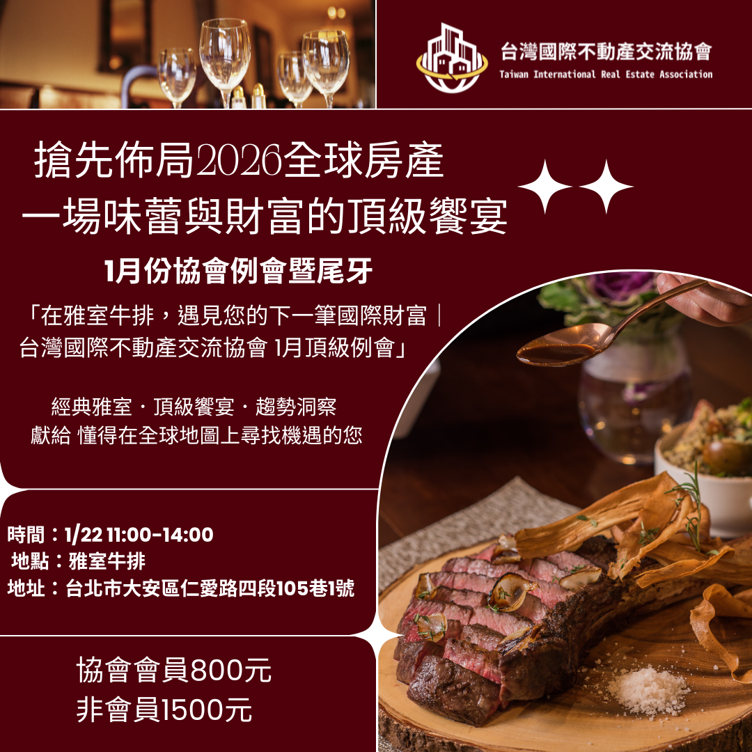 台灣國際不動產交流協會 誠摯邀請您蒞臨 1月份例會暨尾牙。這不只是一場午餐,更是一次與業界頂尖領袖、資深投資人深度交流的機會。