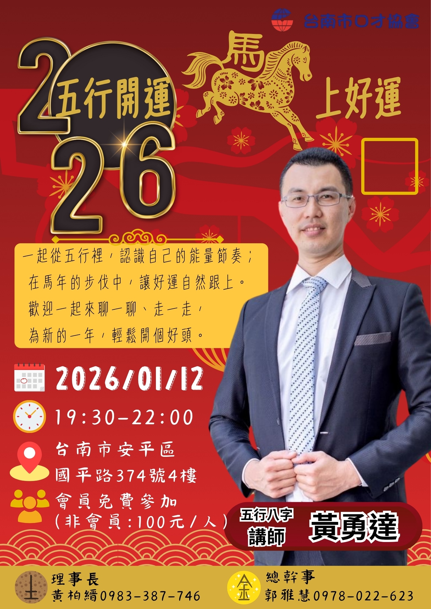 台南市口才協會至今已成立32年,秉持「心想好意、口說好話、身行好事」的宗旨,致力推廣口才藝術的理念,協會透 過辦理課程,訓練口語表達能力,並定期舉辦名人講座,提 供會員多元及跨領域的學習,強化專業技能及提升職場競爭力!!
