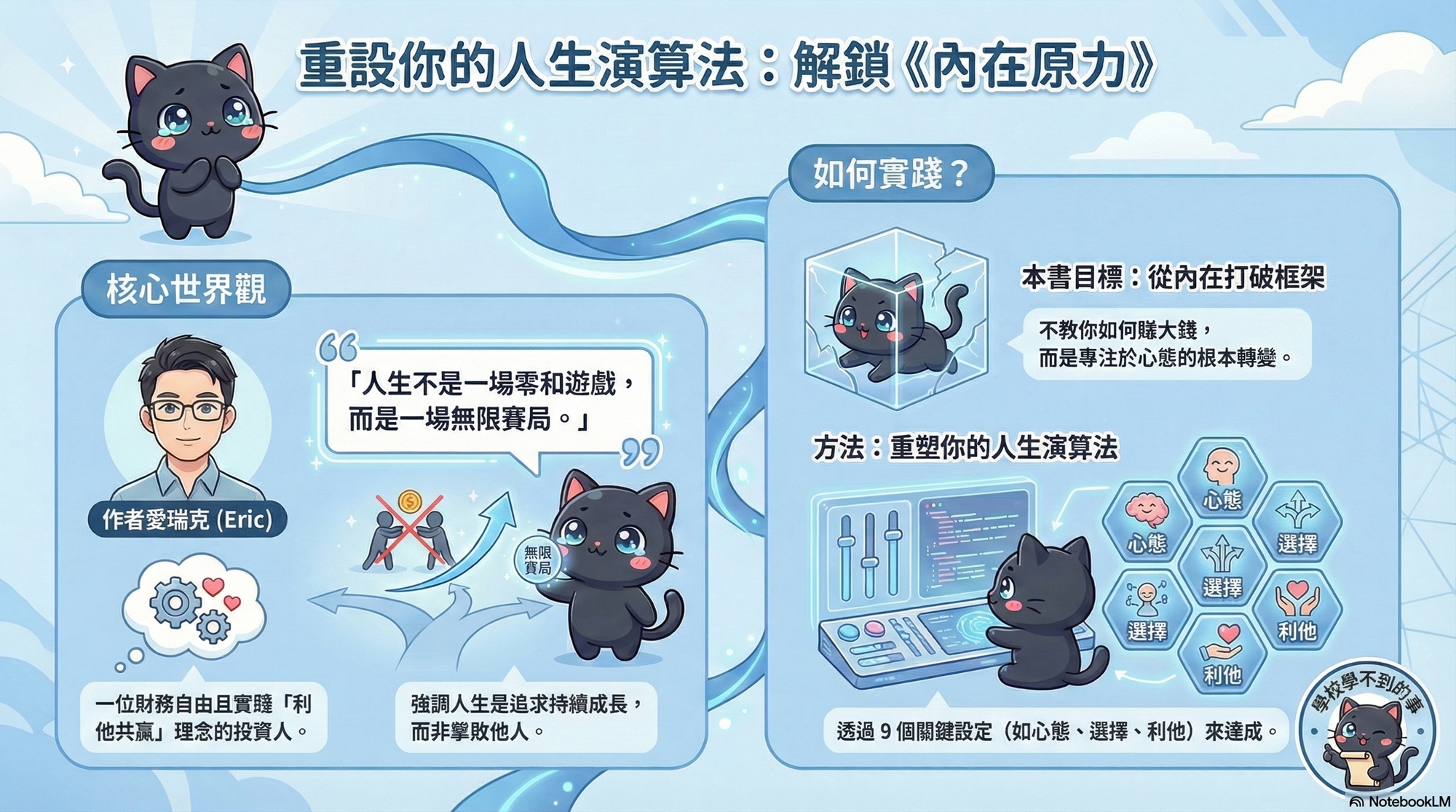 📚 關於這本書與作者愛瑞克 (Eric),不僅是擁有財務自由的投資人,更是「利他共贏」的實踐者。他透過《內在原力》告訴我們:人生不是一場零和遊戲,而是一場無限賽局。