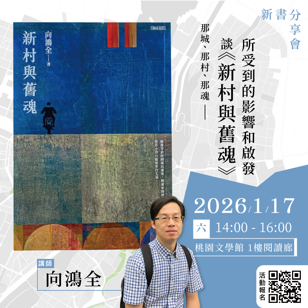 桃園文學館致力於讓「文字」以多元形式在城市中流動 。新年度,我們希望透過在地書寫的深度對話,邀請作家向鴻全老師,以文字編織記憶之網,走入當代的文學空間。 文學除了是個人抒懷,也是時代與地景的見證。向鴻全老師身為戰後移民第二代,長期深耕桃園,其新作《新村與舊魂》將「新村」的國家建設與「舊魂」的家族情感交織,重塑了桃園這座城市中面容漸趨模糊的人事與地景。藉由此場新書分享會,我們希望讓讀者在文學館裡體會:文學的力量,能讓拆遷的房屋與遺失的舊址重新發光,成為開啟城市時空之門的鑰匙。