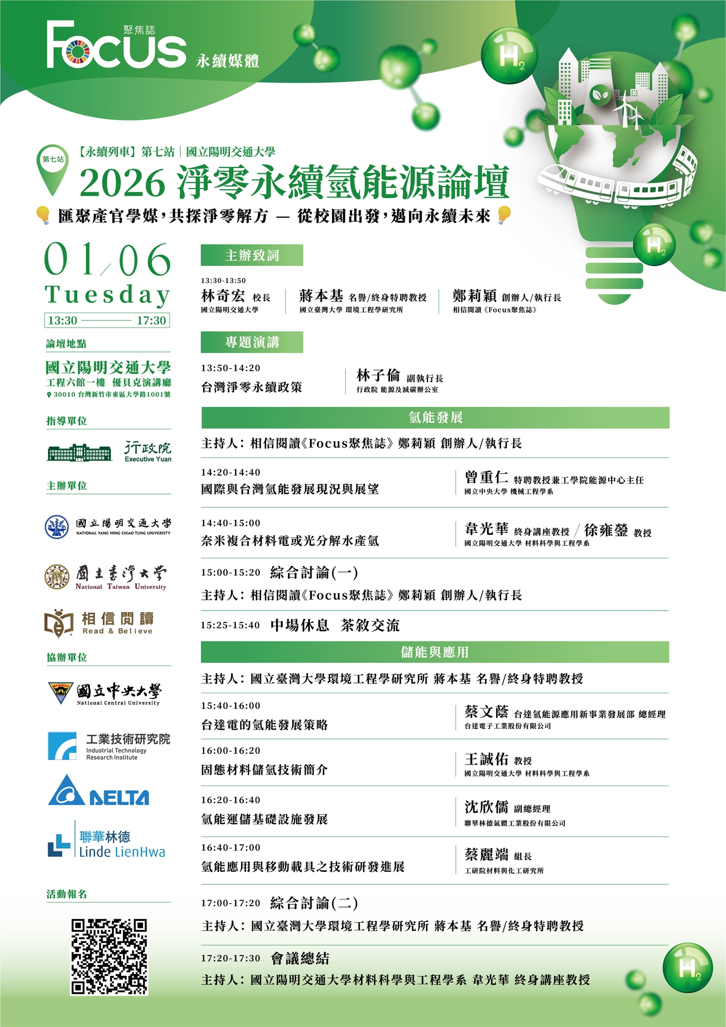 「2026淨零永續氫能源論壇」以氫能關鍵技術與應用為核心主軸,集結產、官、學、媒各界能量,從校園實踐出發,聚焦臺灣邁向淨零排放的重要能源解方。論壇將於115年1月6日於國立陽明交通大學舉行,透過政策視角、前瞻科研與產業實務的深度對話,全面探討氫能在能源轉型中的角色與發展路徑。