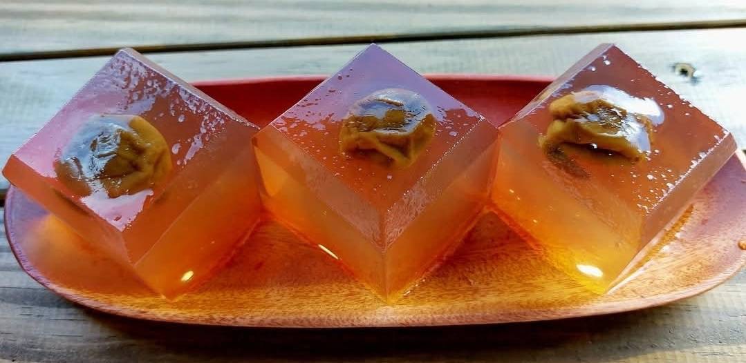 以溫潤茶湯為基底,依比例加入吉利丁與香醇梅汁,慢火攪拌至柔滑融合,再將醃漬梅放入模具,增添層次與果香,風味將更加清爽迷人。酸甜果香與咖啡韻味交織的清新口感,滑順沁涼、優雅回甘,是一款大人味與果香兼具的精緻甜點。