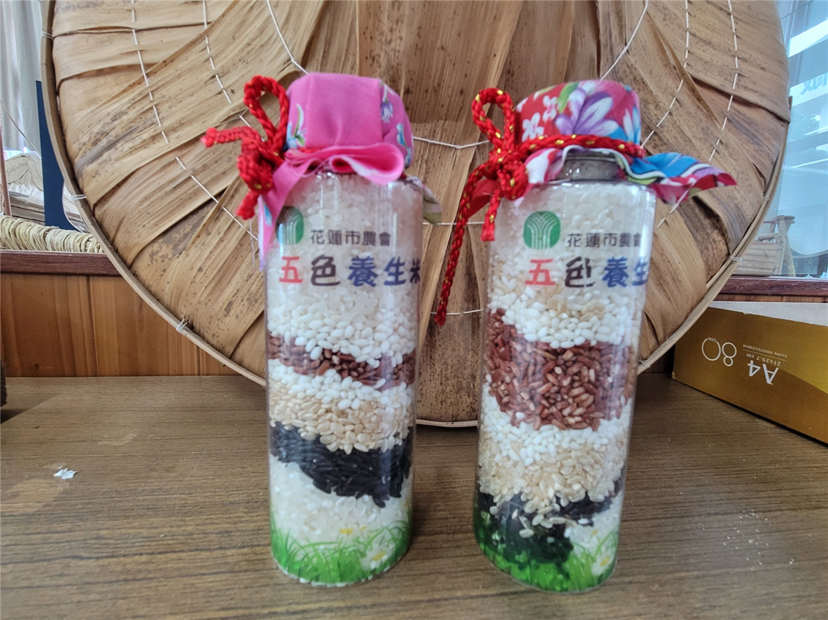 為推廣健康全穀飲食,本次體驗準備白米、糙米、糯米、黑米與紅米等五種稻米,邀請參與者依序裝填入透明瓶罐中,創作專屬於自己的五色米層次設計。透過親手排列不同色澤的米粒,不僅能欣賞自然穀物的美感,也象徵豐收與祝福。完成後再搭配充滿人情味的客家花布裝飾,使其兼具觀賞與實用價值,成為既能擺放、又能料理享用的健康好物。每位參加者皆可帶回一瓶五色養生米,延續體驗中的幸福滋味。