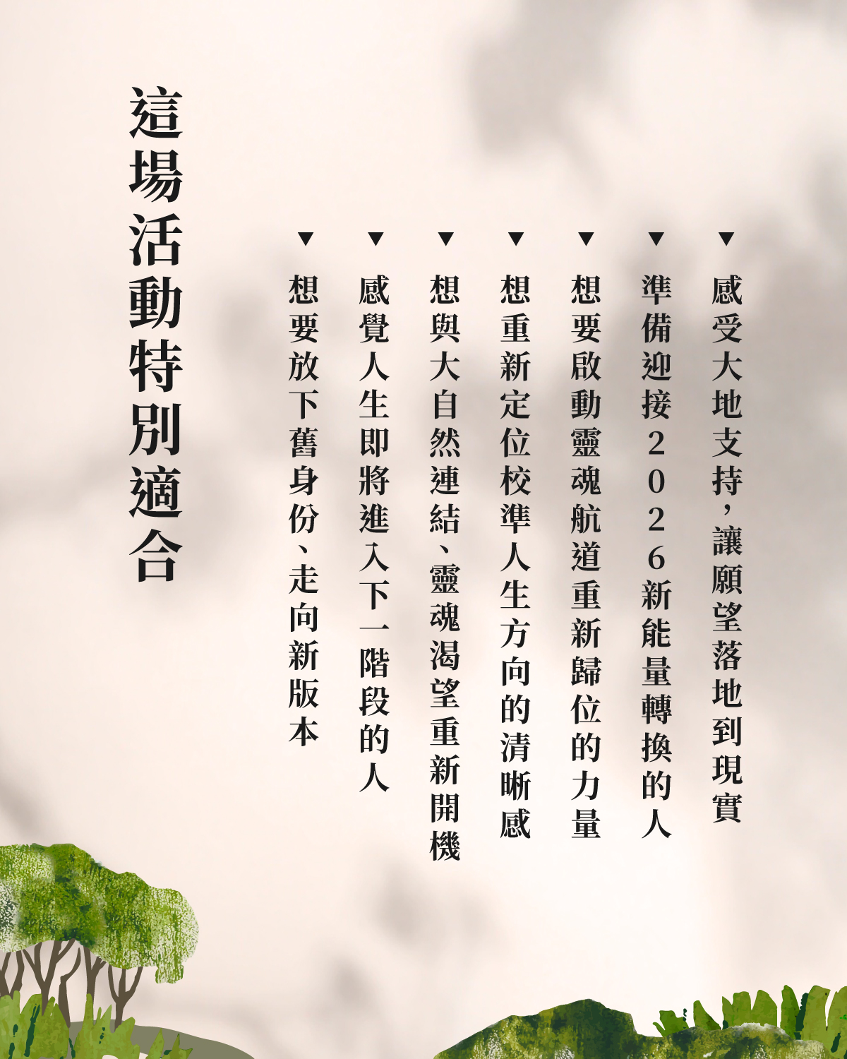當你回到大地,不只是來參與一場活動,你是在啟動自己即將展開的全新生命週期。讓大地最扎根的能量支持你、推動你、滋養你正在展開的道路。