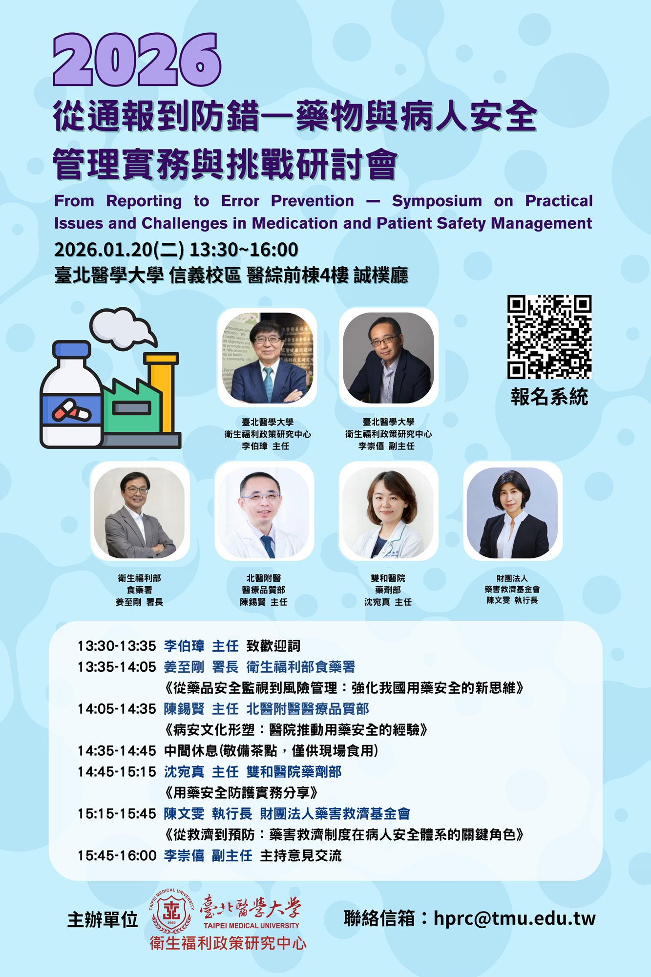 本次研討會以「從通報到防錯—藥物與病人安全管理實務與挑戰」為主題,聚焦於藥物事件防錯與病人安全通報的制度建構,期盼透過臨床經驗與政策實務的交流,探討如何強化防錯流程、提升通報效能,推動醫療機構在安全文化與品質管理上持續精進,讓「安全用藥」成為全民信任醫療的共同基石。