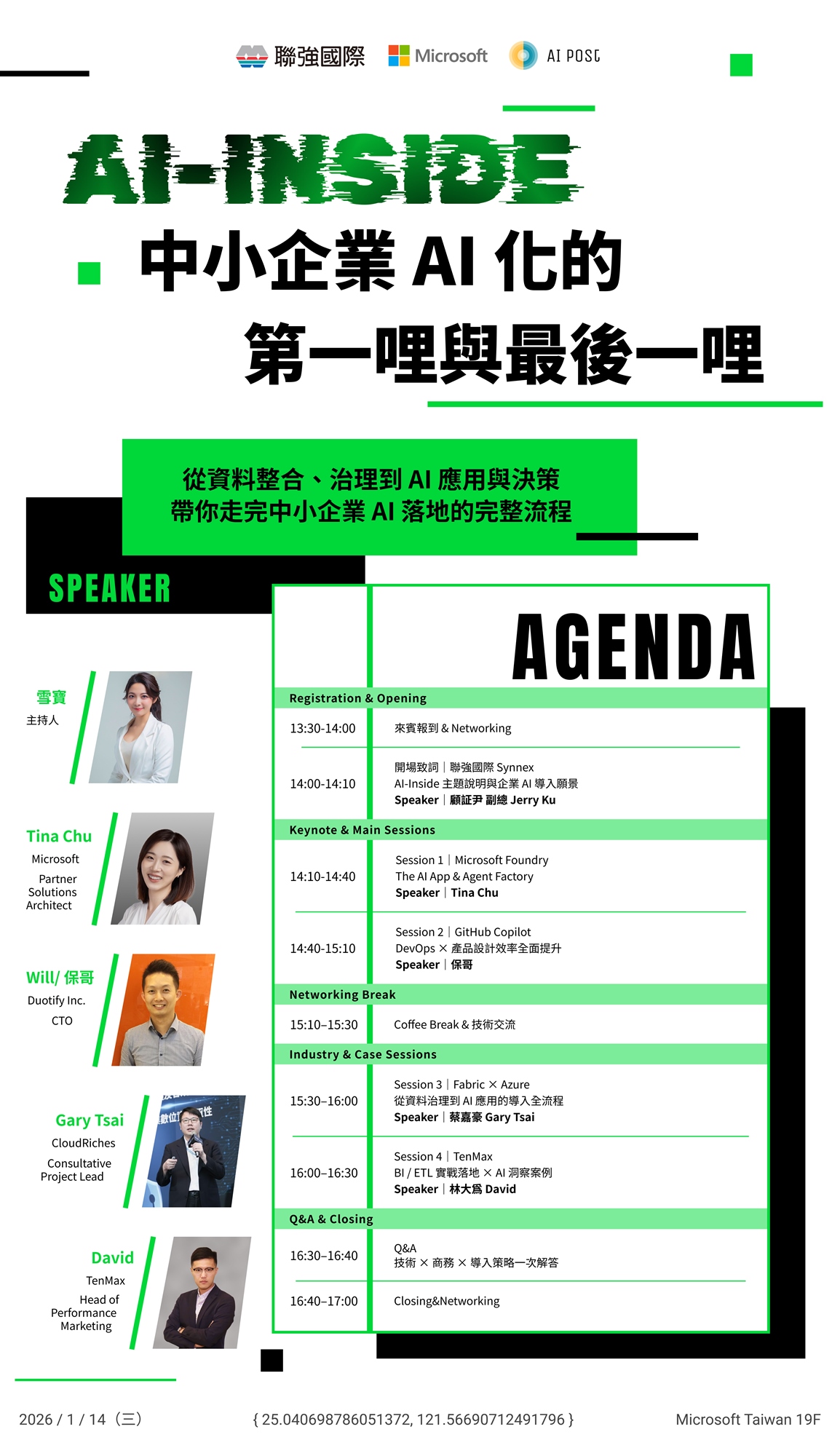 本活動以 Microsoft Azure AI 與 Microsoft Fabric 為技術主軸,從企業最常卡關的資料整合與治理談起,逐步延伸至 AI App / Agent 建構、DevOps 與產品效率提升,並最終回到企業決策與商業價值,完整拆解 「第一哩到最後一哩」的 AI 導入實戰路徑。