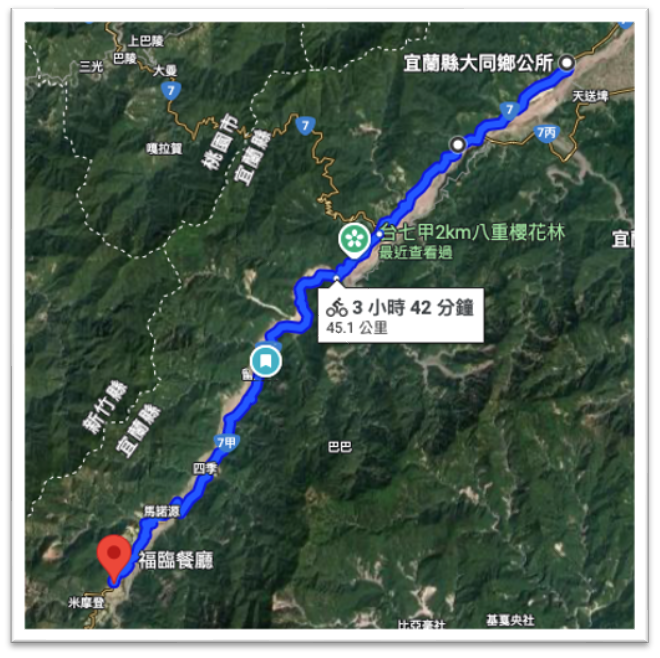 活動路線 | 宜蘭縣大同鄉公所(起點)➜員山路三段(台7線) ➜泰雅路一段(台7線)➜泰雅路二段(台7線)➜泰雅路三段(台7線)➜泰雅路四段(台7甲線)➜泰雅路五段(台7甲線)➜泰雅路六段(台7甲線)➜泰雅路六段(台7甲線)➜福臨餐廳(終點) | ||