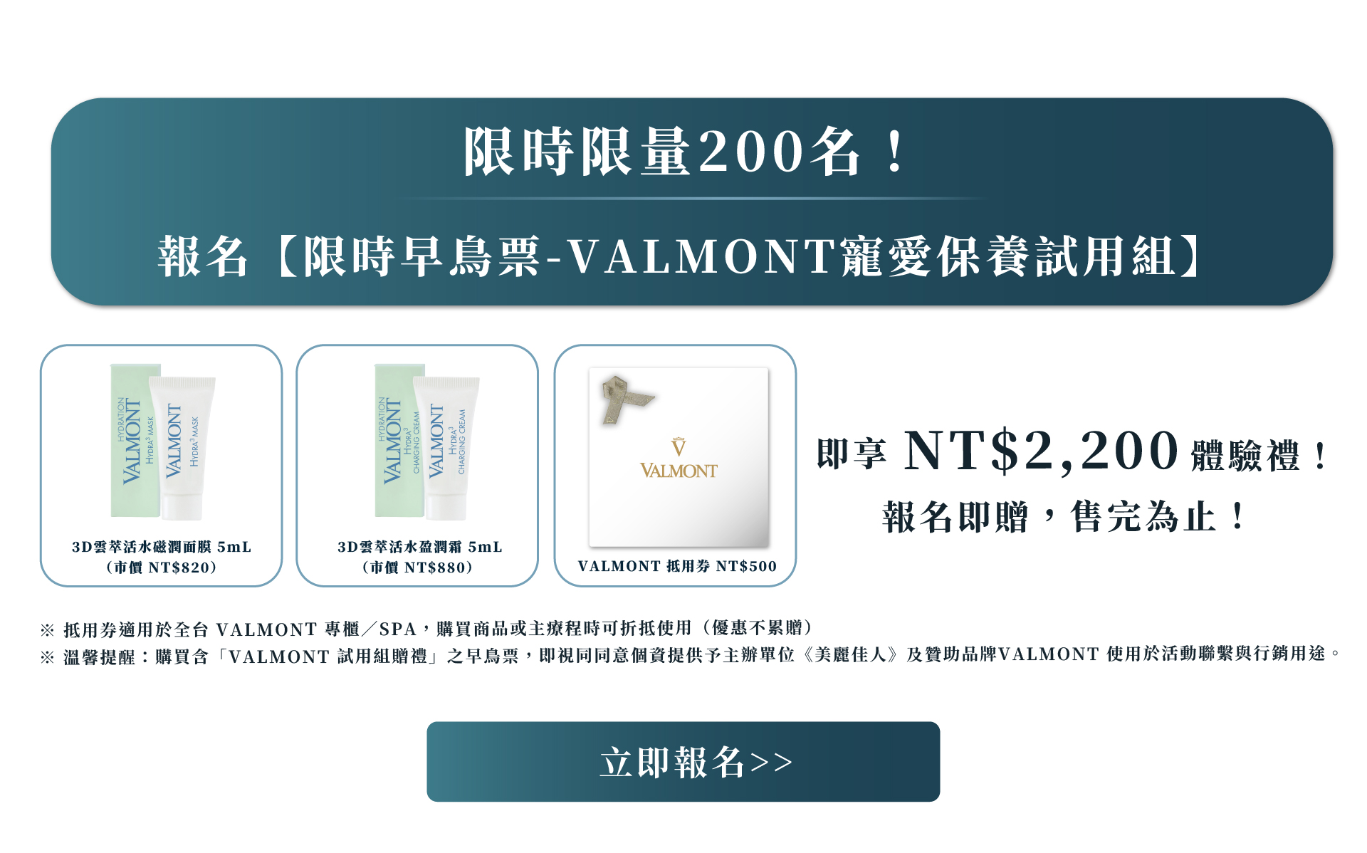 - 本活動購買「VALMONT寵愛保養組贈禮」早鳥票,即表示同意將您個人資料,提供給主辦單位 《美麗佳人》與贊助品牌VALMONT使用。