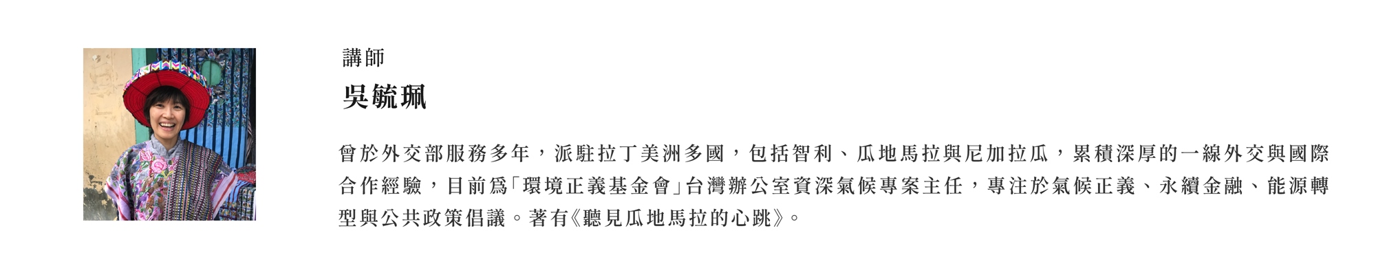 本次講堂邀請到新書《聽見瓜地馬拉的心跳》的作者吳毓珮,她曾擔任外交人員超過二十年,也曾在主要負責外援計畫的國合會服務,對外交工作有非常豐富實務經驗的她,將帶來派駐現場的第一手觀察與反思。
