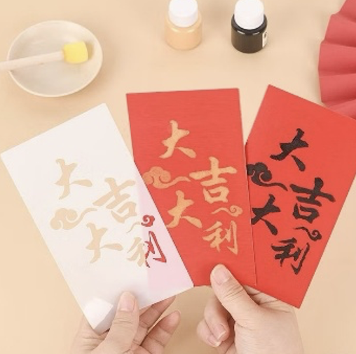 「拓印」讓書法變簡單又好玩😆! 利用模具與海綿刷🧽,蘸上富貴金漆,在紅紙上輕輕拍打,「大吉大利」瞬間浮現。金紅交織既華麗又喜氣,無論是創意斗方或是專屬紅包袋,都是獨一無二的心意。把這份閃亮作品送給親友,傳遞最溫暖的金色祝福🌟。