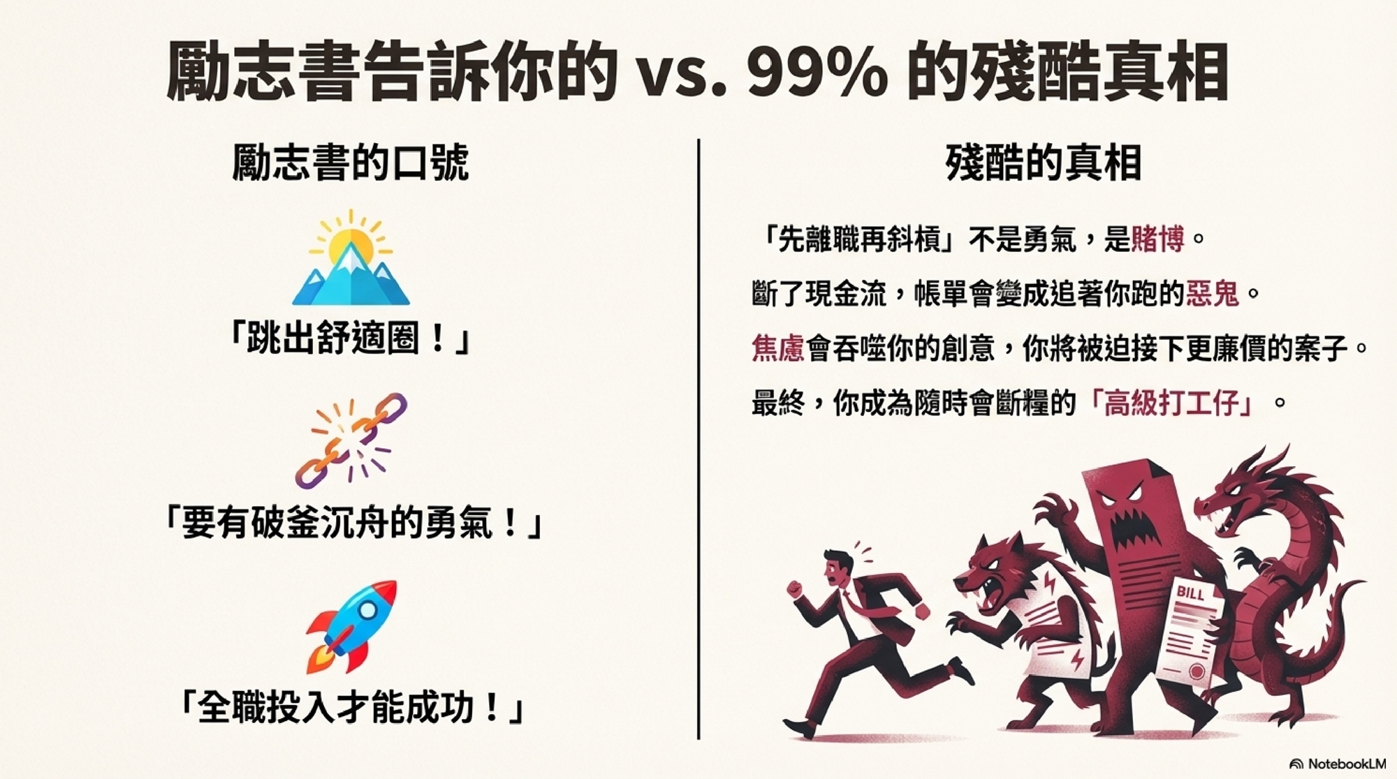 但讓我告訴你一個殘酷的真相:對於 99% 的上班族來說,「先離職再斜槓」不是勇氣,而是賭博,甚至是最高風險的自殺策略。