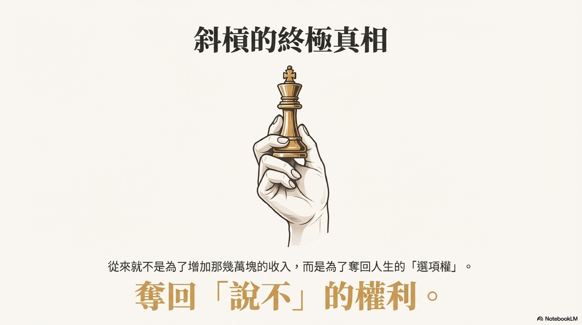 差別在於你是否理解 —— 斜槓真正的目的,從來就不是為了增加那幾萬塊的收入,而是為了奪回人生的「選項權」。