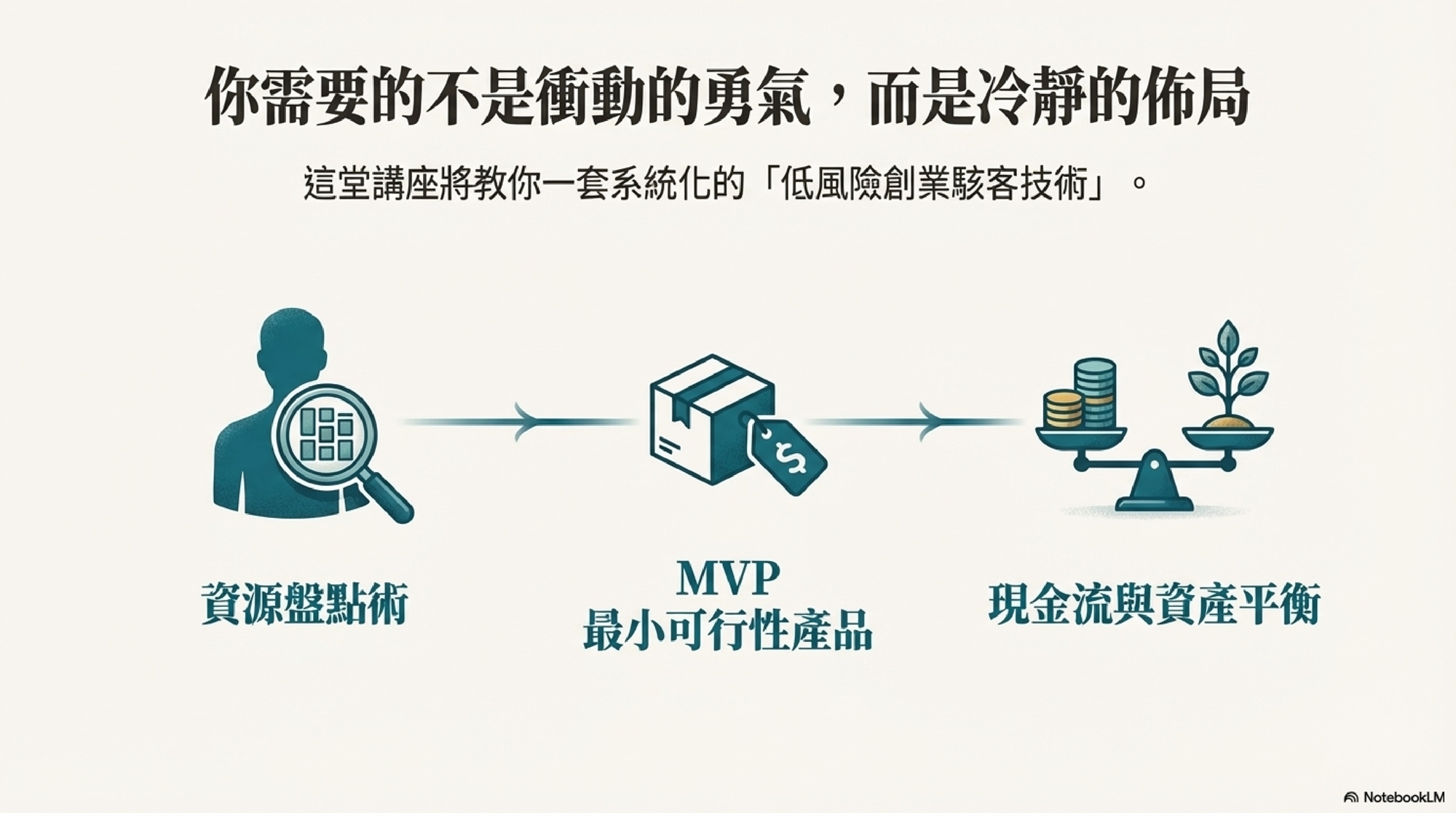 這堂課將帶你走過五大實戰模組:從分析高風險策略的陷阱,到確立選項權思維;從挖掘你的變現資源,到設計你的第一個 MVP 產品,最後建立長期的資產護城河。