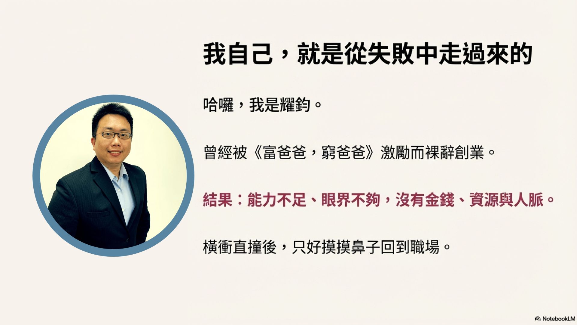 可因為當時能力不足、眼界不夠,又沒有足夠的金錢、資源與人脈,更沒有像富爸爸那樣的靠山。