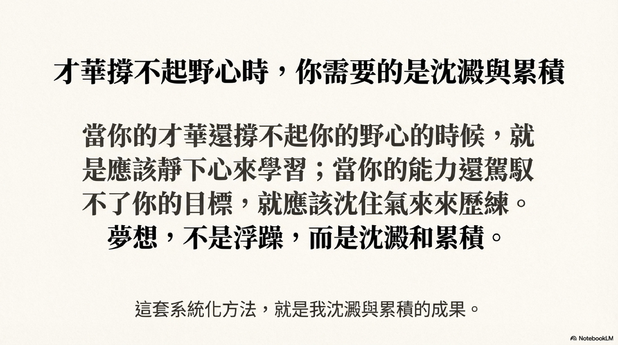 「當你的才華還撐不起你的野心的時候,就應該靜下心來學習;當你的能力還駕馭不了你的目標時,就應該沈住氣來歷練。夢想,不是浮躁,而是沈澱和累積」