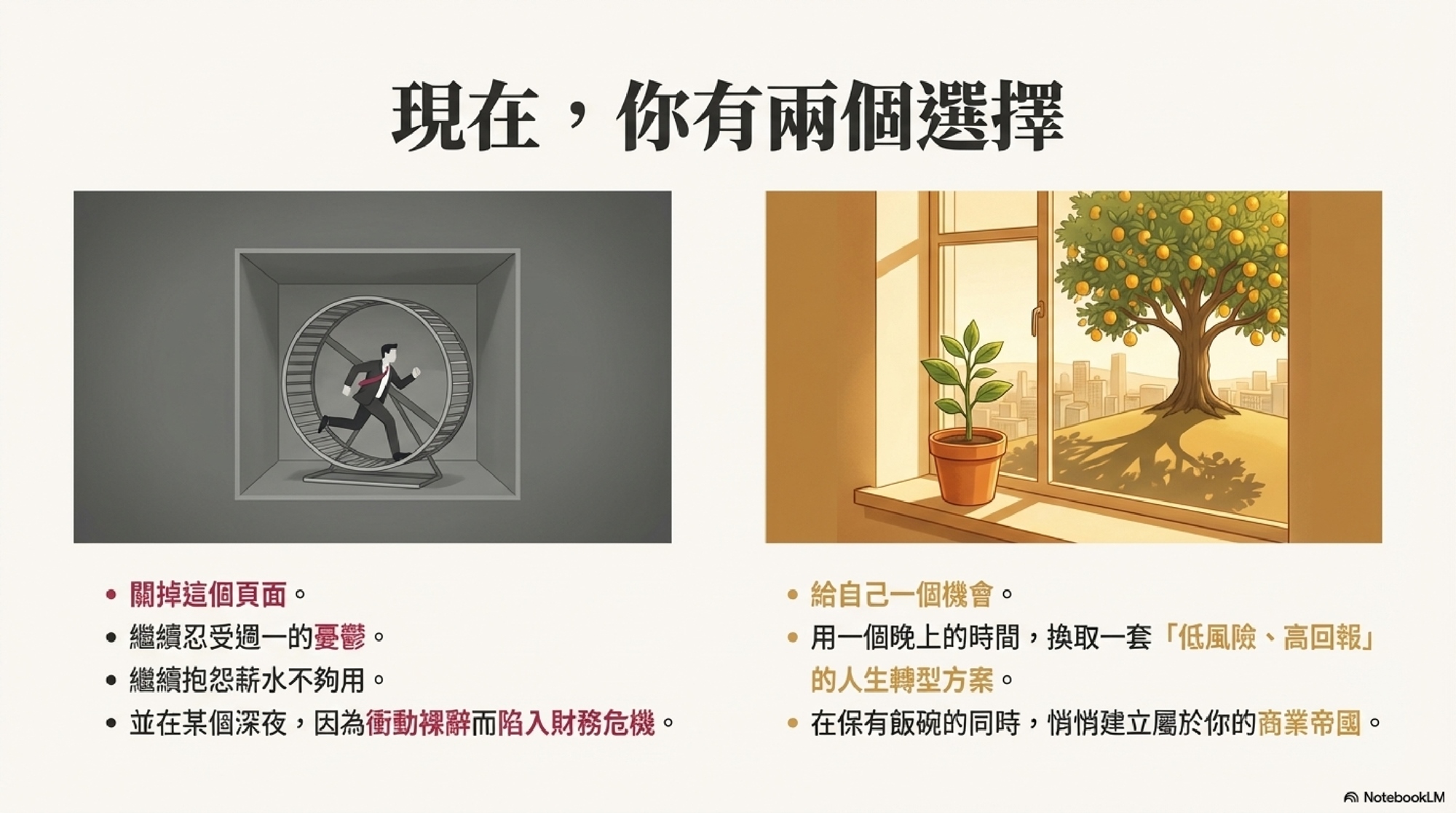 選項一:關掉這個頁面,繼續忍受週一的憂鬱,繼續抱怨薪水不夠用,並在某個深夜因為衝動裸辭而陷入財務危機。