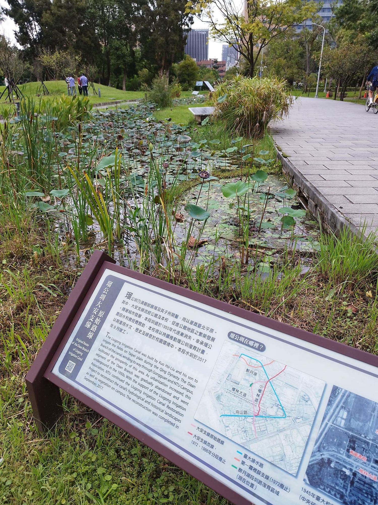 台大校園內:新生南路3段旁有復刻的水圳意象步道(大灣草圳),水流來自青潭堰,串連醉月湖,展現人與自然的共生空間。