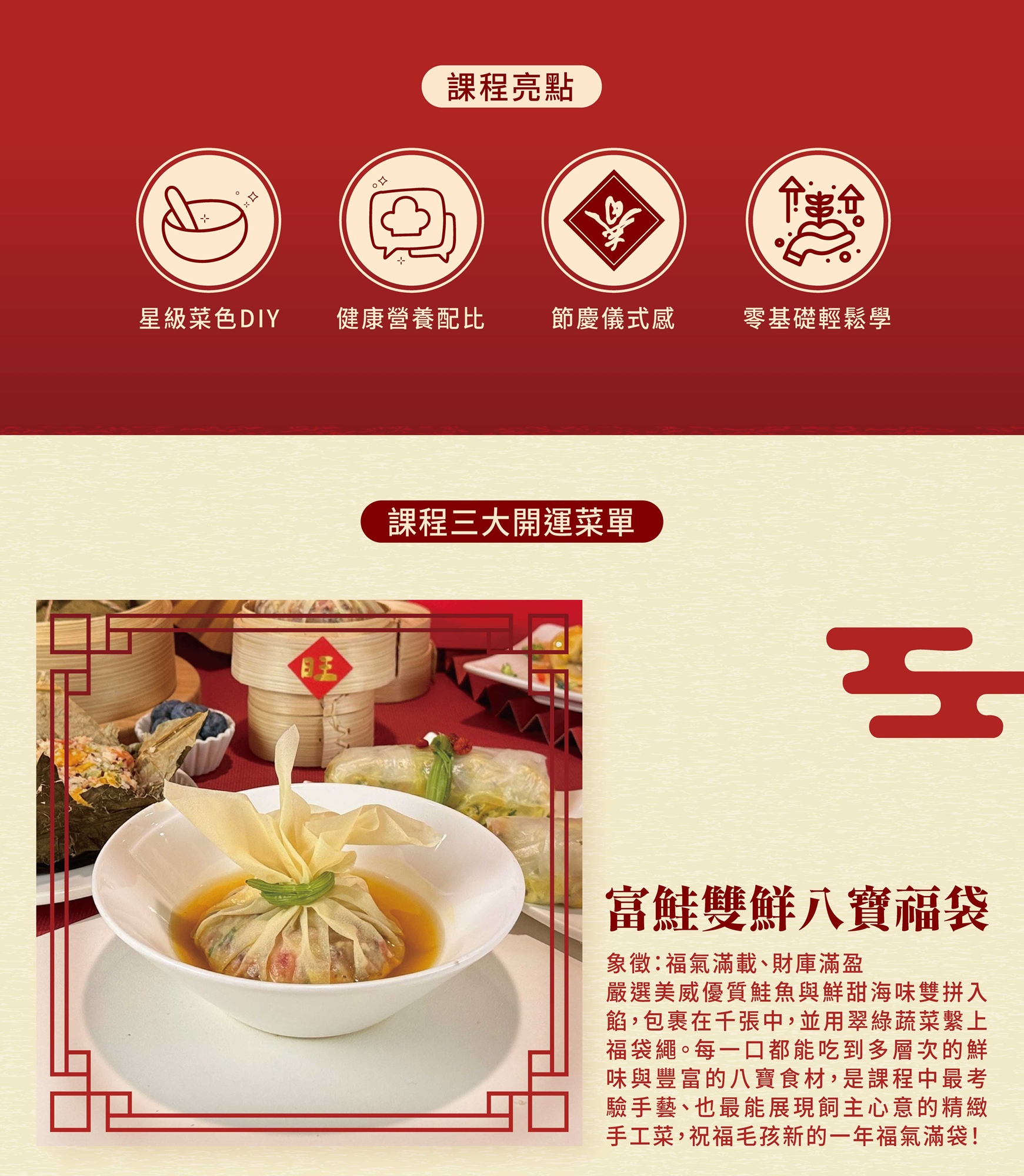 在 3 小時的課程中,主廚將手把手教您製作 3 道開運料理: