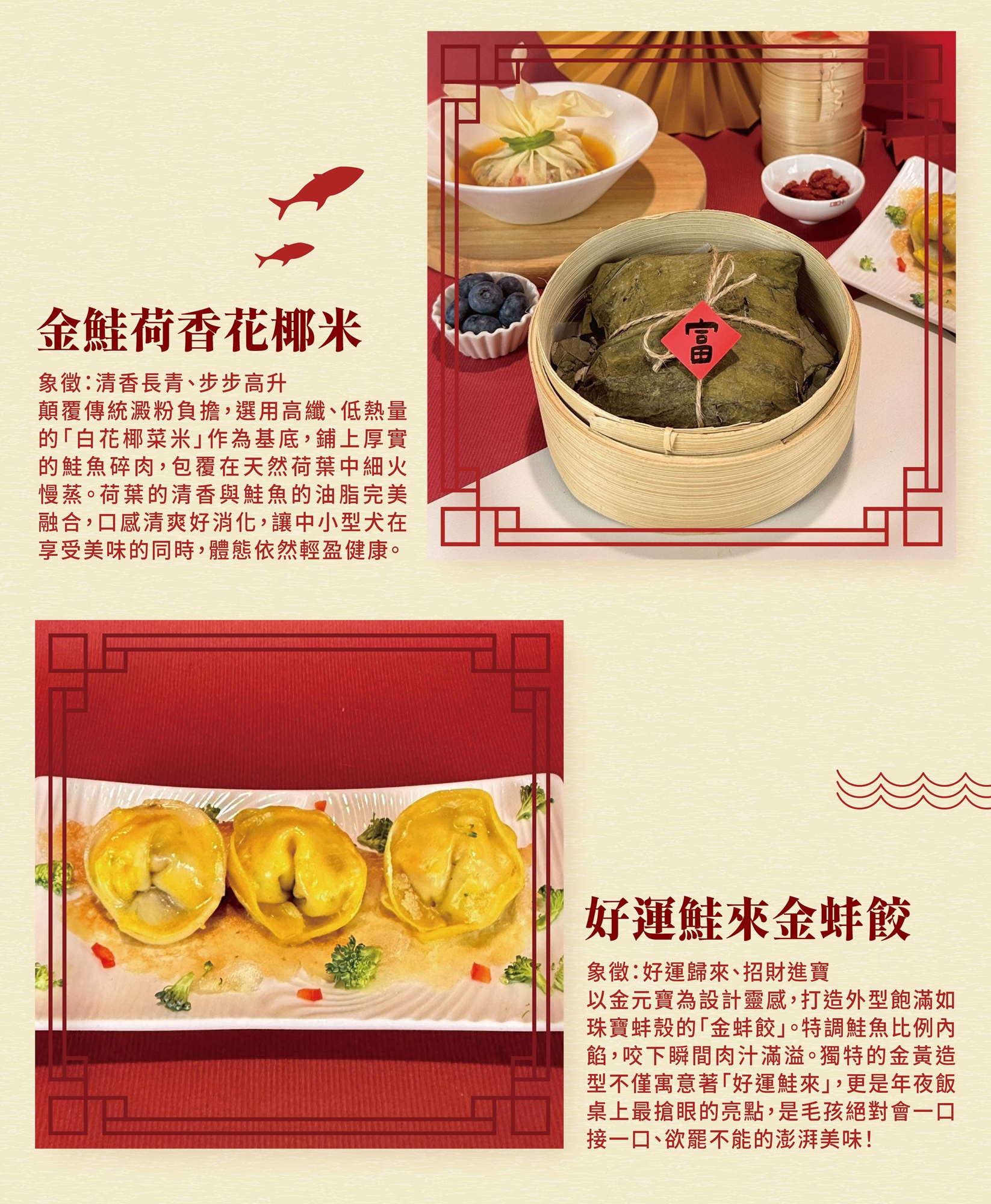 以金元寶為設計靈感,打造外型飽滿如珠寶蚌殼的「金蚌餃」。特調鮭魚比例內餡,咬下瞬間肉汁滿溢。獨特的金黃造型不僅寓意著「好運鮭來」,更是年夜飯桌上最搶眼的亮點,是毛孩絕對會一口接一口、欲罷不能的澎湃美味!