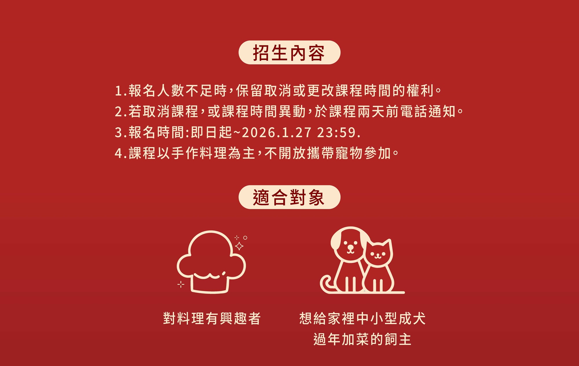 每年吃年夜飯,看著毛孩在桌下用渴望的眼神看著大魚大肉,卻因為太油、太鹹而不能分享嗎? 今年,我們邀請您親手為毛孩製作一份「開運年菜組」,將健康與祝福通通裝進年菜裡!