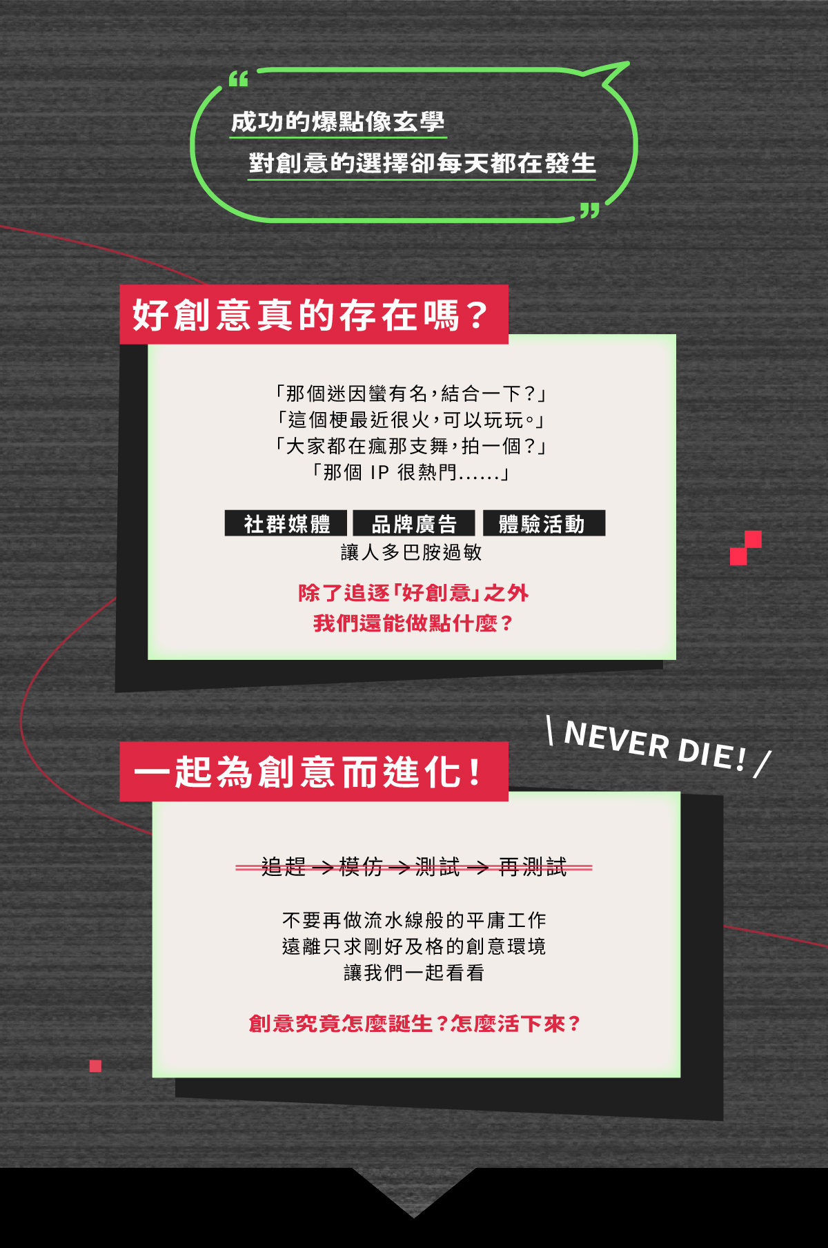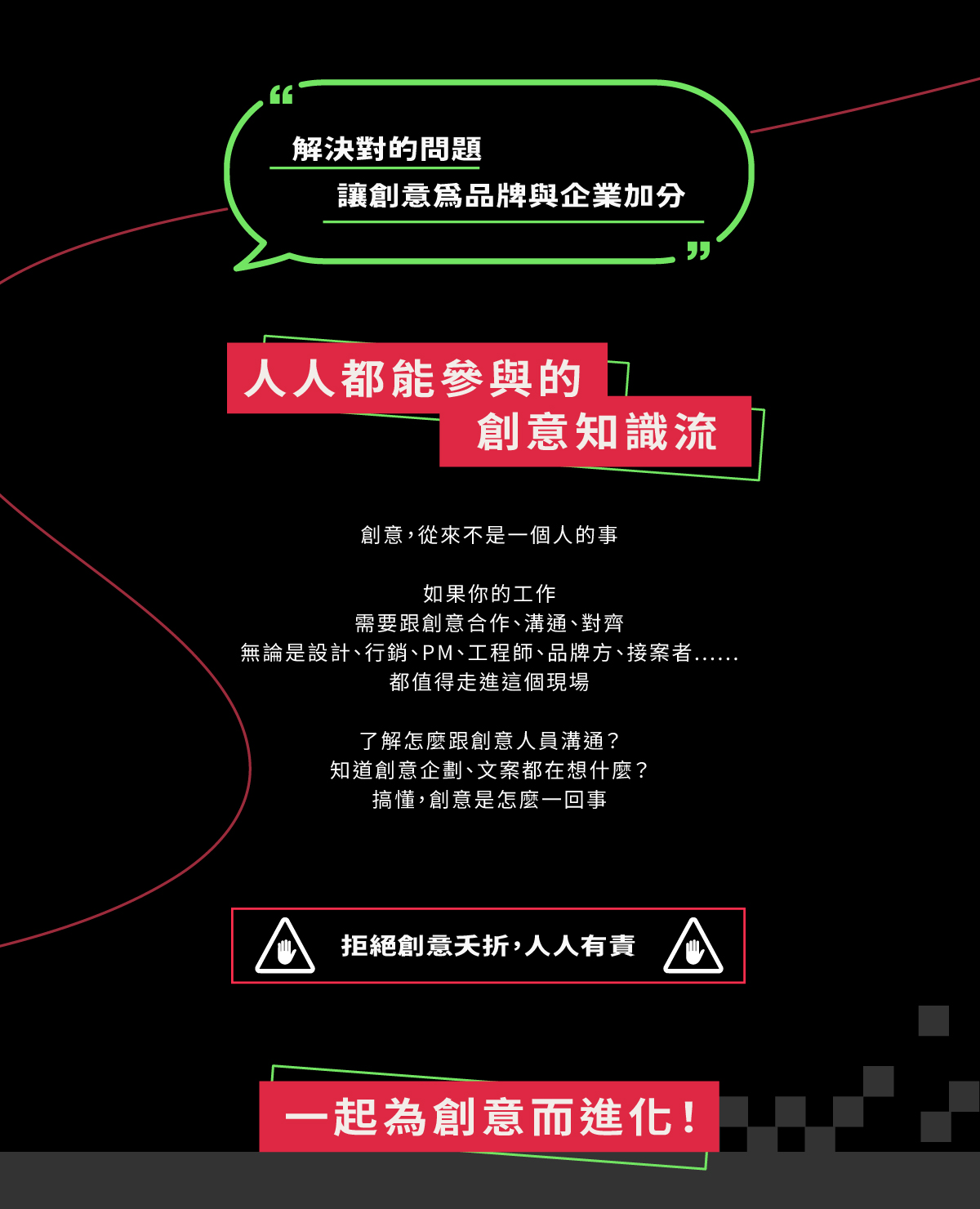 不一定需為創意產業工作者,但非常適合工作 1-3 年內,從事的工作涉及:體驗活動、創意行銷、品牌溝通、團隊合作或互動設計的工作者參與。若有非相關領域或學生,我們也非常歡迎你的加入!