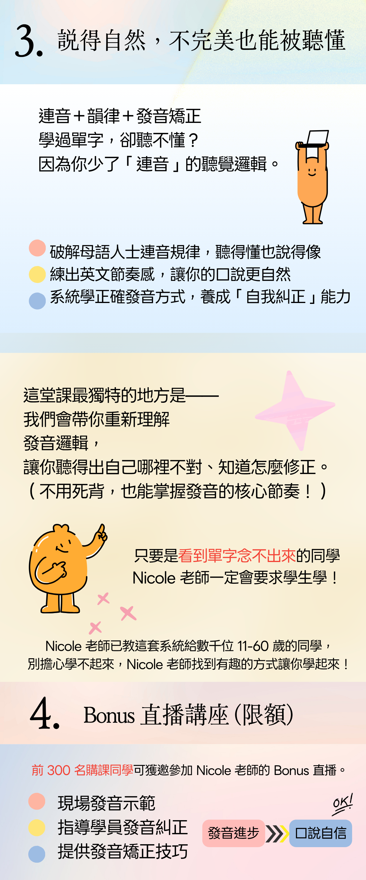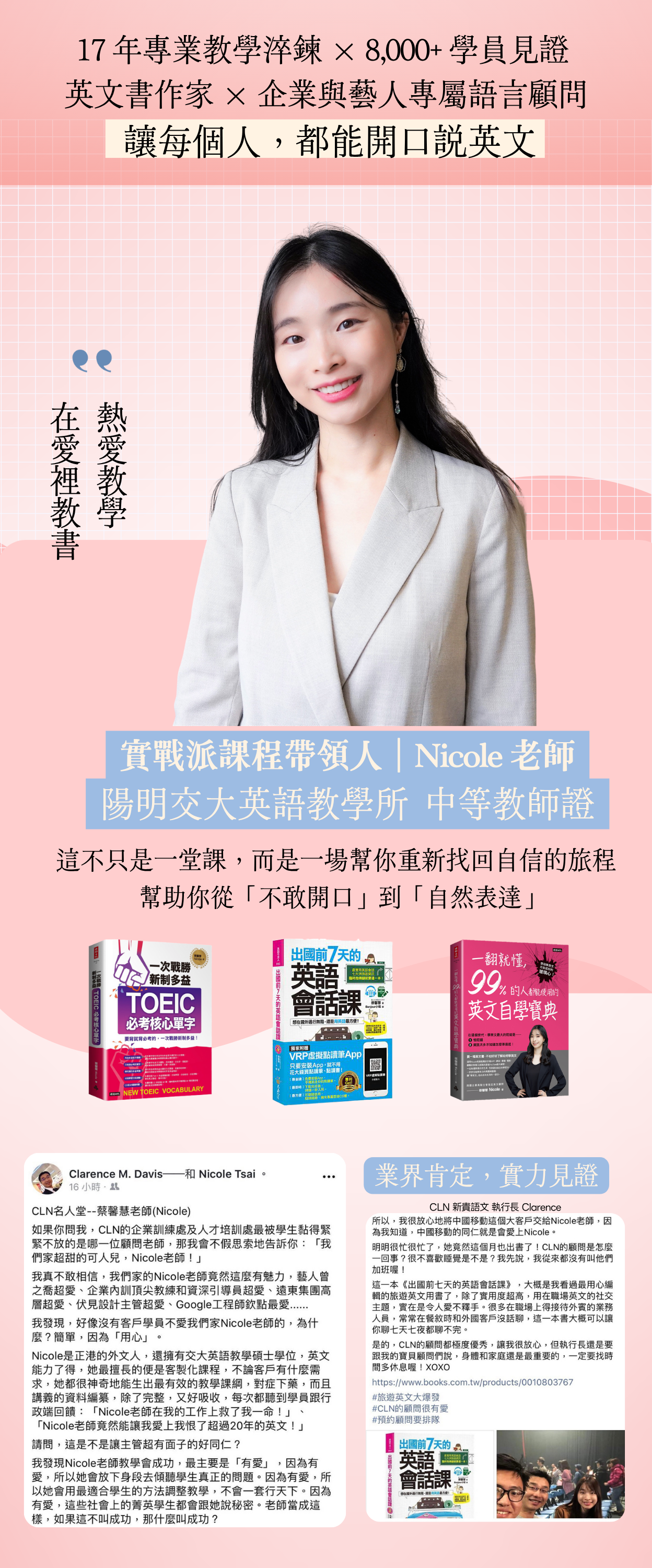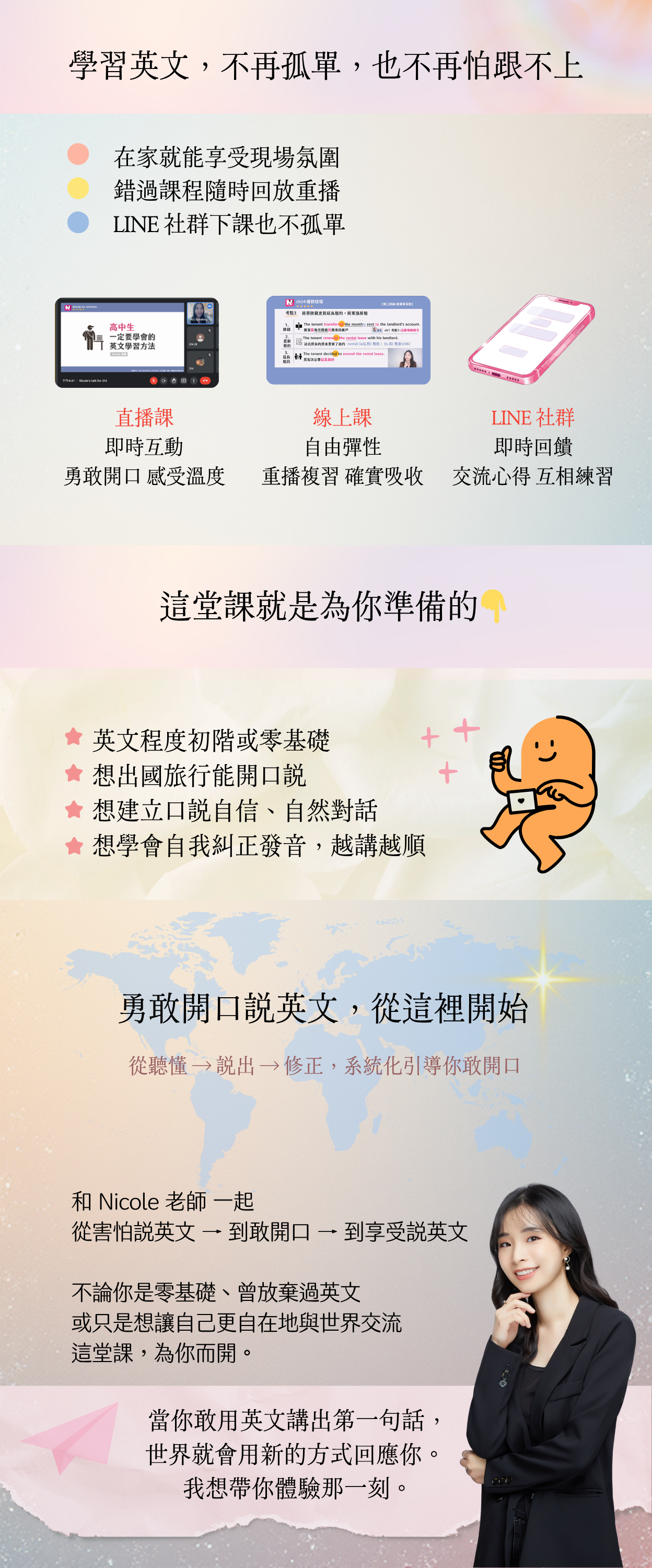 由 Nicole 老師親自指導矯正發音,幫你開口更自信。