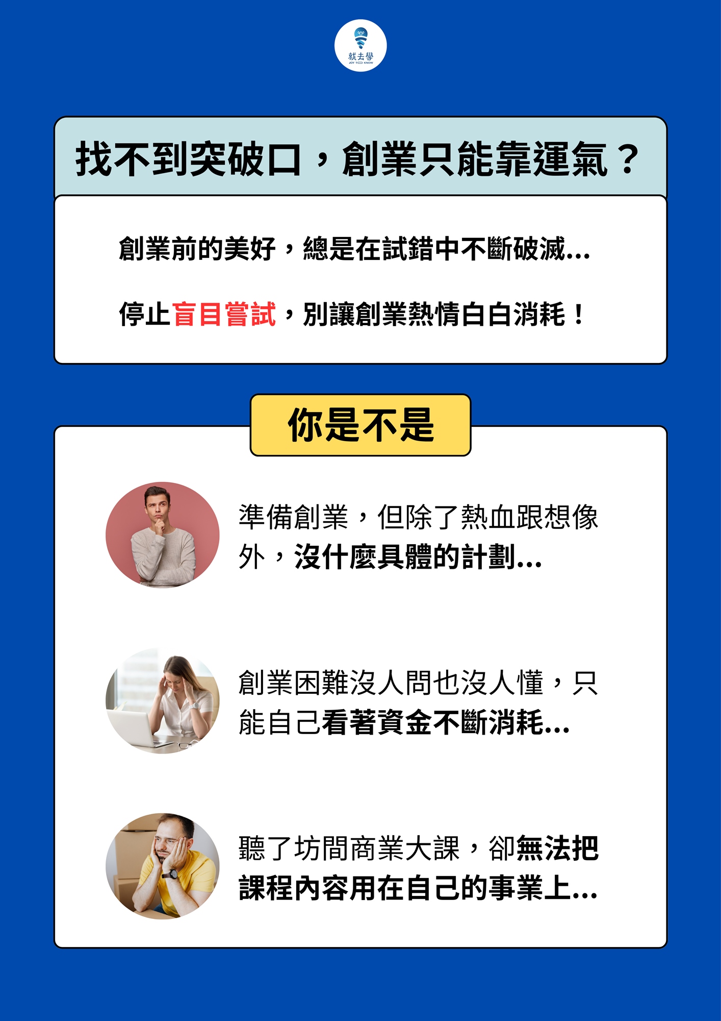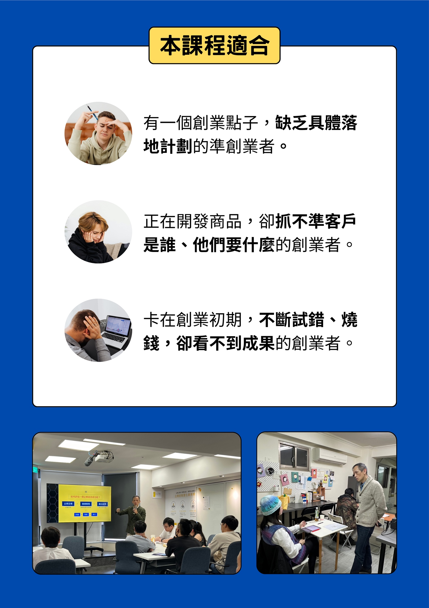 - 已經創業的人:產品賣不動、客群抓不準,急需尋找突破口。