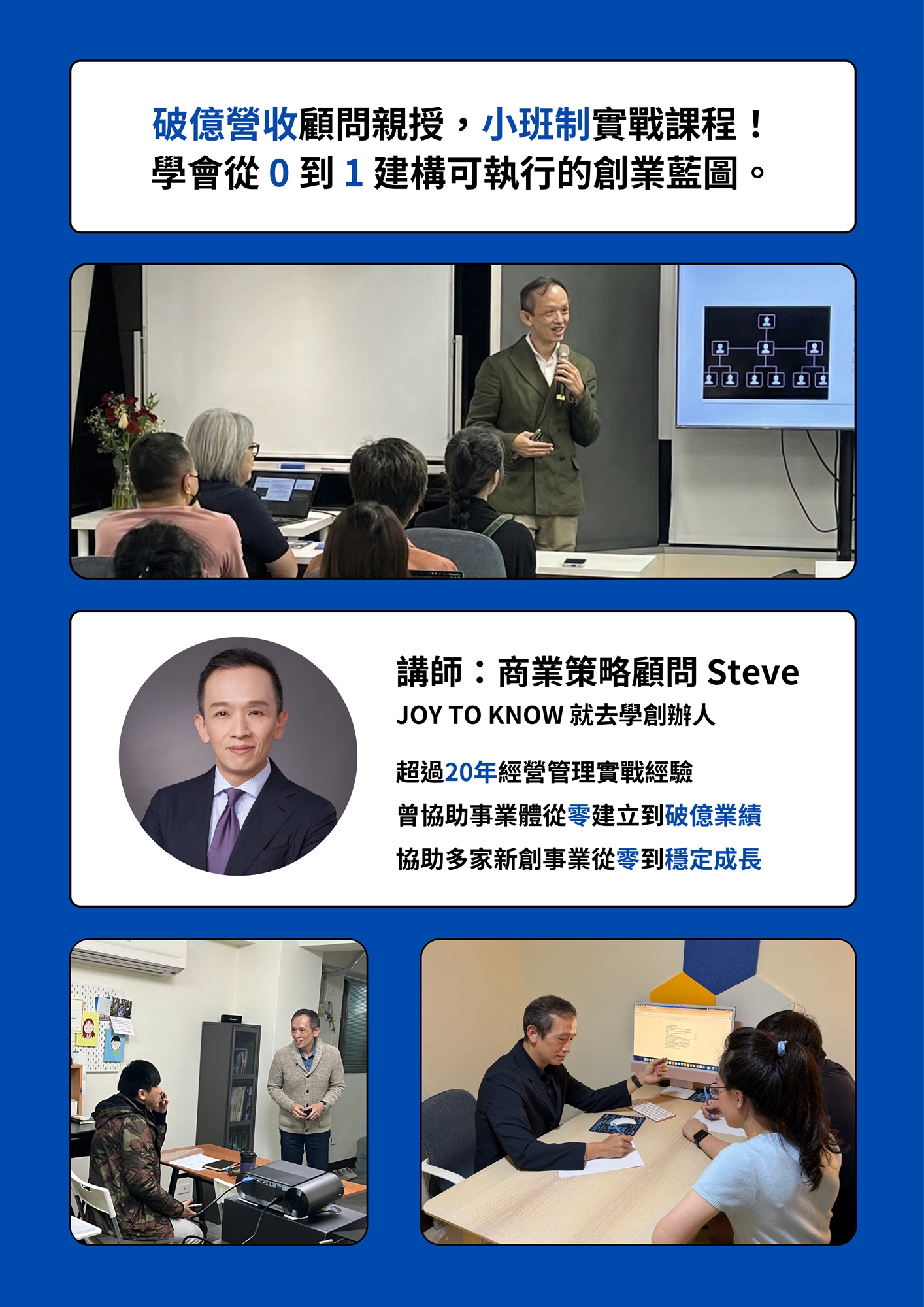 - 輔導實績:協助多家新創事業從零到 穩定成長,跨越生存線。