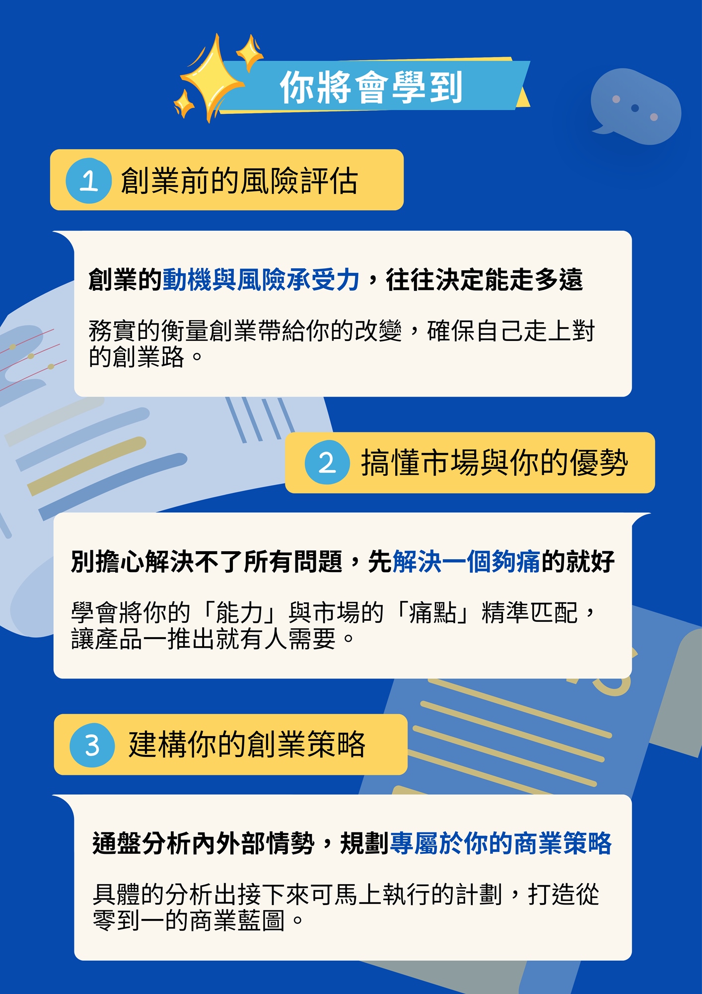 幫我釐清創業的大方向,也學到很多具體的分析工具,對接下來的創業規劃真的很有幫助!