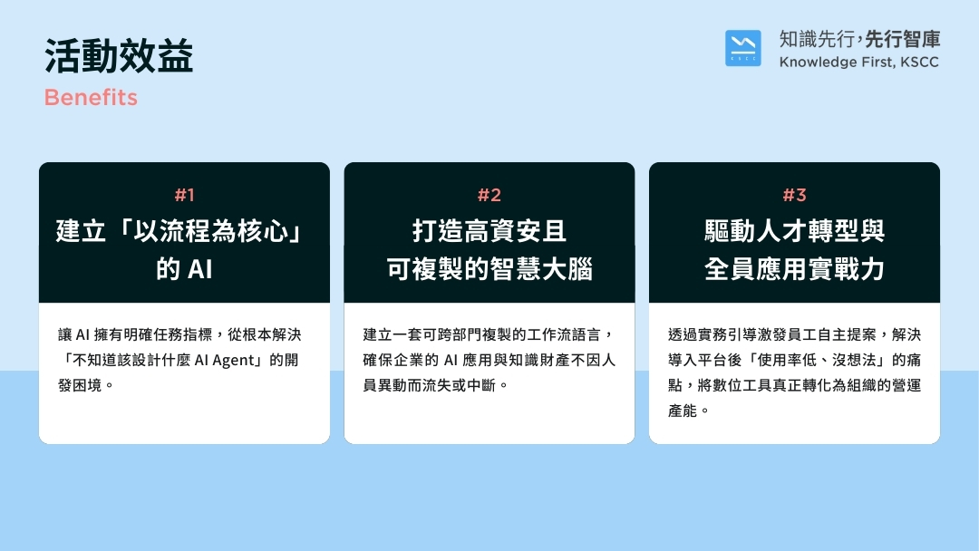 本研討會將由先行智庫董事長暨執行長 蘇書平 Steve 老師分享實際輔導化工與製藥業的經驗,揭密為什麼「工作流程」的標準化比 AI 工具更優先 。我們將展示如何透過「流程盤點工作坊」找出關鍵節點,並運用「AI導入方法論+流程盤點工作坊 + 企業級 AI 平台」將隱性經驗轉化為可複製的組織能力 。