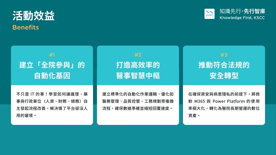 - 掌握多維度落地案例:學習醫療單位內部 20 多個單位(含行政、醫療、工務、護理之家)如何同步透過數位賦能產出成果。