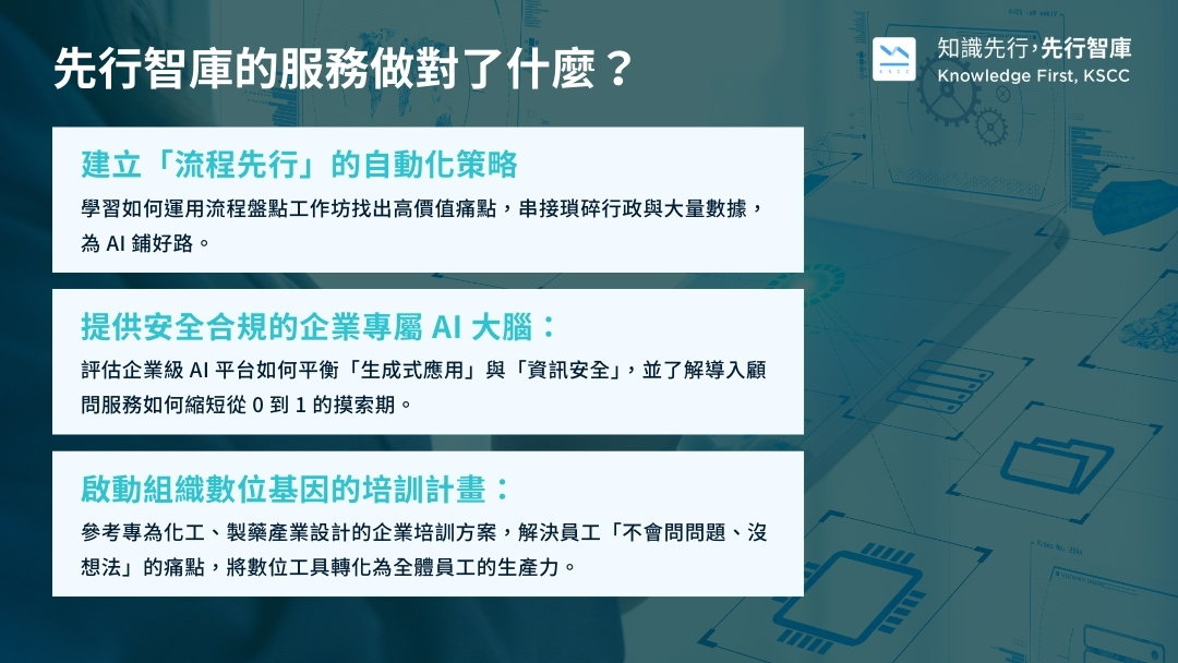 Dylan 從「工作流程」與「使用場景」切入,解決企業導了 AI 卻不知道如何定義場景的困境 。精準對齊營運、IT 與 HR 需求,協助醫療、化工、營建等各界頂尖單位,將隱性經驗標準化,落實真正的數位轉型效益。